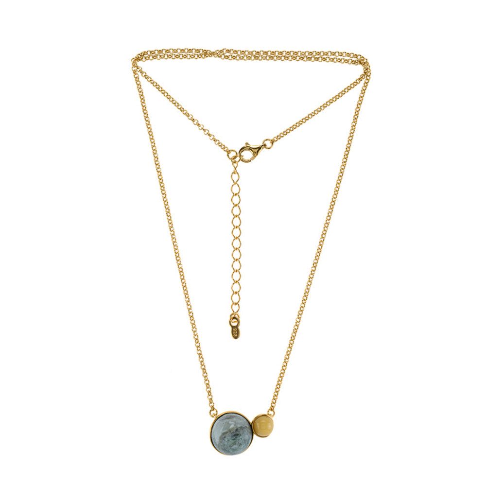 Das Edelstein-Silbercollier Dagen präsentiert sich als ein zartes Kunstwerk, das speziell für Damen entworfen wurde, die sowohl Qualität als auch Stil schätzen. Im Mittelpunkt steht der sattgrüne Fuchsit aus Brasilien, ein runder Cabochon von beeindruckenden 7,36 Karat, der meisterhaft in 925er vergoldetes Sterling Silber eingefasst ist. Ergänzt wird er durch einen kleineren, warm schimmernden baltischen Bernsteincabochon aus Polen mit 0,36 Karat. Diese Kombination schafft eine harmonische Farbsymphonie, die vielseitig zu legeren Outfits ebenso wie zu eleganter Abendgarderobe passt. Ob zum Business-Meeting oder Dinner – dieses Schmuckstück verleiht jeder Garderobe natürliche Eleganz mit einem Hauch erdiger Exklusivität.