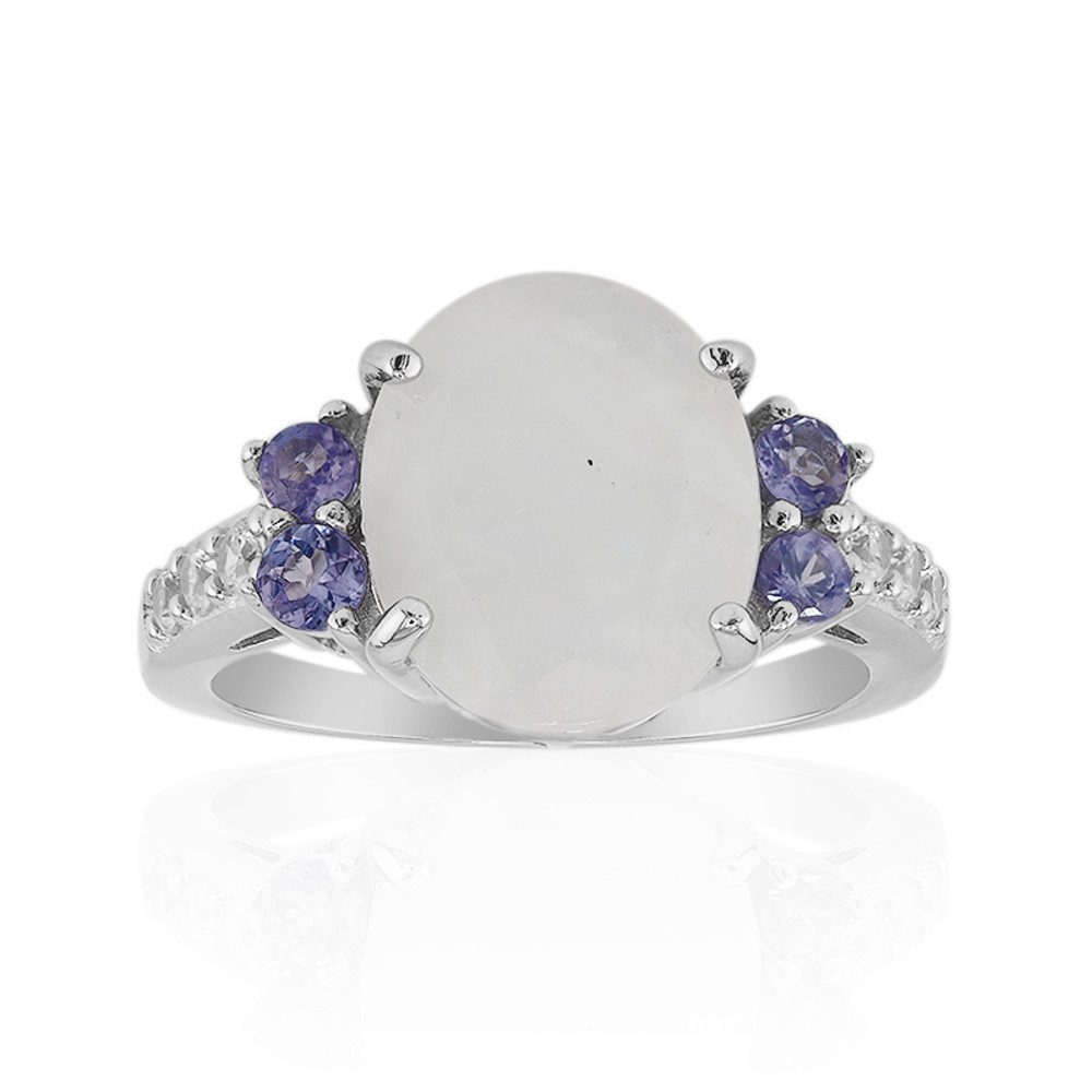 Unser Regenbogen-Mondstein-Silberring ist ein exquisiter Einstieg in die Welt der Edelsteinringe und begeistert mit einem 4,14 Karat schweren, ovalen Regenbogenmondstein aus Indien, der durch sein faszinierendes Farbspiel besticht. Umrahmt von vier runden, blau schimmernden Tansaniten und sechs funkelnden Zirkonen aus Tansania, vereint dieser Ring natürliche Schönheit mit edlem 925er Sterling Silber. Für Erstkäufer ein eleganter Begleiter im Alltag, für Kenner ein meisterhaft gefasstes Schmuckstück, das sowohl zu festlichen Anlässen als auch zur Verlobung getragen werden kann. Kombinieren Sie diesen Ring mit einem klassischen Abendkleid oder stilvollen Business-Outfit, um einen Hauch von Luxus und Charisma zu verleihen.