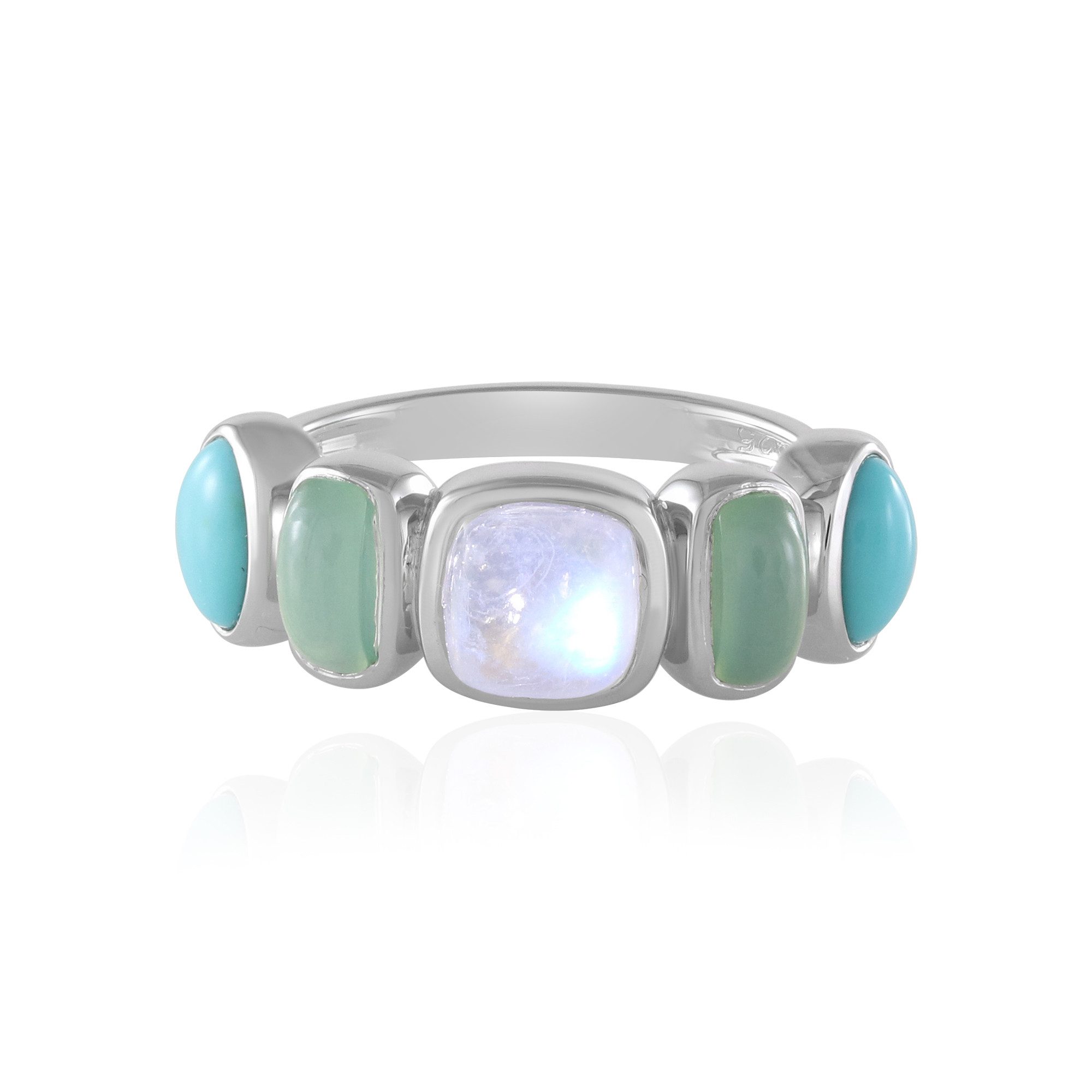Dieser exquisite Edelstein-Silberring von KM by Juwelo bietet ein faszinierendes Erlebnis für alle Schmuckliebhaber. Der 0,99 Karat schwere blaue Mondstein im antiken Kissenschliff, direkt aus Indien, wird gekonnt in 925er Sterling Silber eingefasst. Ergänzt wird er durch zwei strahlende Sleeping Beauty Türkis-Cabochons aus den USA sowie zwei grüne Chalcedon-Cabochons aus Indien, die dem Ring eine harmonische Farbkomposition verleihen. Ob für Erstkäufer oder erfahrene Sammler: Das elegante Design macht den Ring zum perfekten Begleiter für elegante Abendkleider, stilvolle Business-Outfits oder als besonderes Highlight bei festlichen Anlässen.