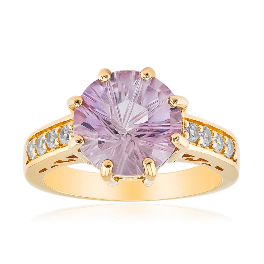 Entdecken Sie mit dem Bolivianischer Amethyst-Silberring ein faszinierendes Schmuckstück, das besonders für Erstkäufer ideal ist: Der prächtige bolivianische Amethyst mit einem Gewicht von 3,105 Karat wurde im eleganten runden Fancy-Schliff meisterhaft eingefasst und von acht funkelnden Zirkonen aus Tansania eindrucksvoll ergänzt. Die Kombination aus dem violetten Edelstein und dem vergoldeten 925er Sterling Silber verleiht dem Ring eine edle Präsenz, die sowohl zu besonderen Anlässen als auch im Alltag getragen werden kann. Für erfahrene Schmuckliebhaber bietet der Ring eine wohlüberlegte Balance zwischen opulenter Eleganz und moderner Leichtigkeit. Tragen Sie ihn zu einem klassischen schwarzen Kleid bei Abendveranstaltungen oder setzen Sie mit einer stilvollen Bluse und Jeans elegante Akzente im Alltag.