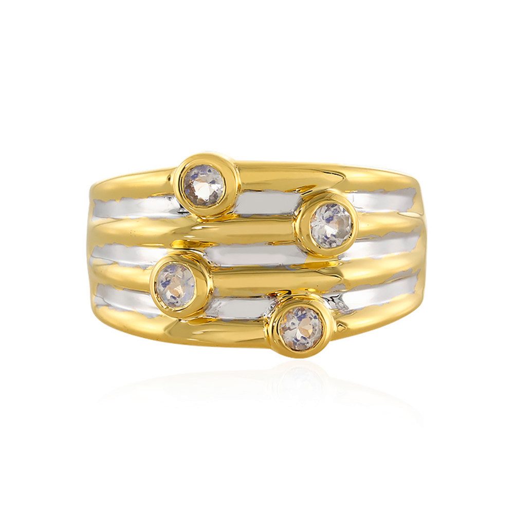 Der Regenbogen-Mondstein-Silberring präsentiert sich als elegantes Schmuckstück, das sowohl Neulinge als auch erfahrene Liebhaber von Edelsteinen begeistert. Vier sorgfältig von Indien eingeführte Regenbogen-Mondsteine im Rundschliff mit insgesamt 0,387 Karat sind meisterhaft in vergoldetem 925er Sterlingsilber eingefasst. Das mehrreihige, moderne Design verbindet goldene und silberne Elemente zu einem stilvollen Kontrast, der sowohl zu legeren als auch formellen Anlässen passt. Tragen Sie diesen Ring zu einem eleganten Abendkleid oder kombinieren Sie ihn mit einem modernen Business-Outfit, um Ihren Look mit einem schimmernden Highlight zu vervollständigen.