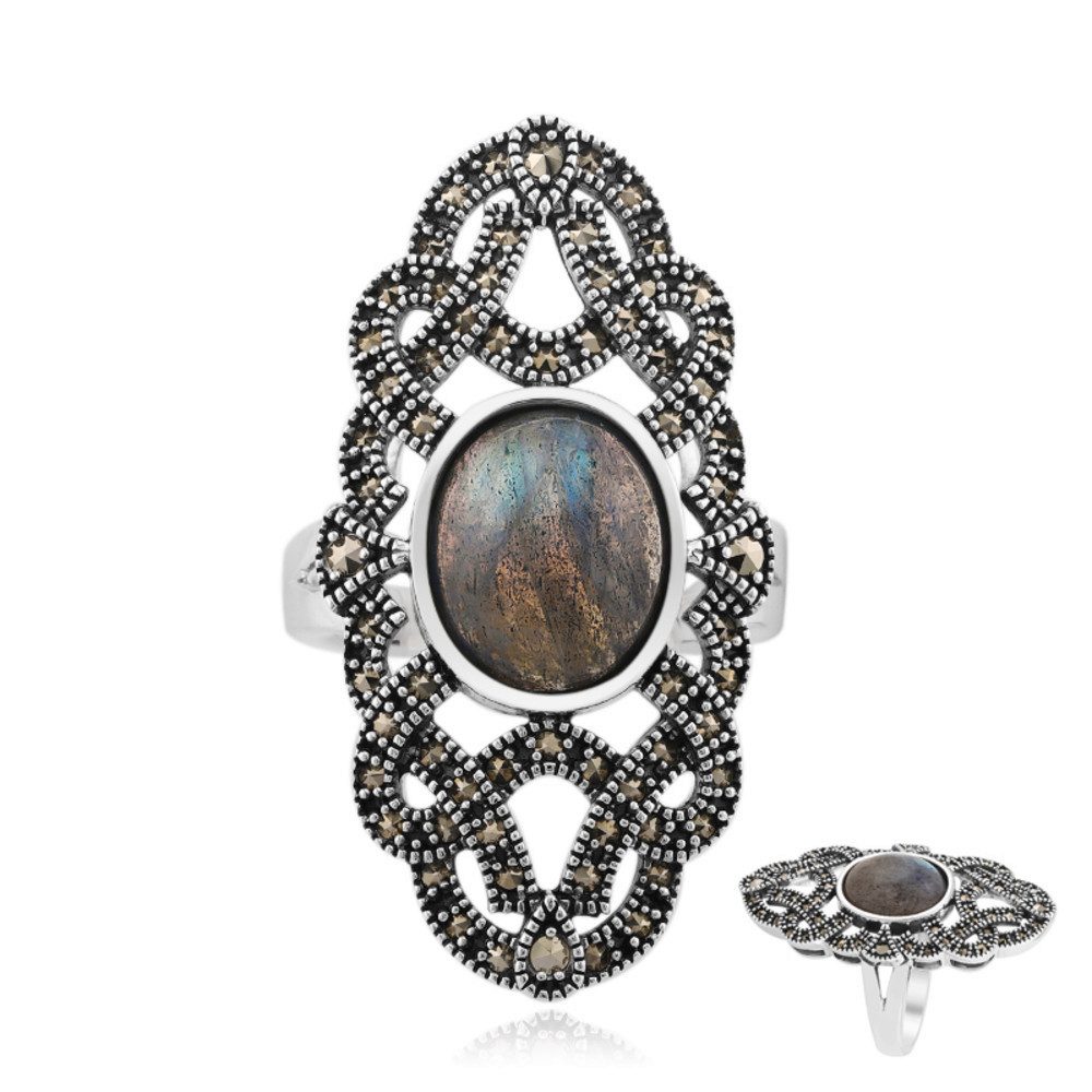 Der Labradorit-Silberring (Annette classic) ist ein faszinierendes Schmuckstück, das sowohl für Erstkäufer als auch für erfahrene Schmuckliebhaber perfekt geeignet ist. Der atemberaubende ovale Labradorit-Cabochon mit 3,4 Karat aus Madagaskar fängt das Licht spielerisch ein und zeigt seinen charakteristischen schimmernden Effekt. Umgeben von funkelnden Markasiten aus Österreich, präsentiert sich der Ring in hochwertigem 925er Sterling Silber und besticht durch seine filigrane vintage-inspirierte Gestaltung. Dieses elegante Accessoire lässt sich sowohl als modischer Statement-Ring tagsüber als auch als funkelndes Highlight bei festlichen Anlässen wie Galas und eleganten Abendessen tragen. Kombinieren Sie ihn mit einem klassischen Etuikleid für zeitlose Eleganz oder setzen Sie einen stilvollen Kontrapunkt zu modernen Outfits.