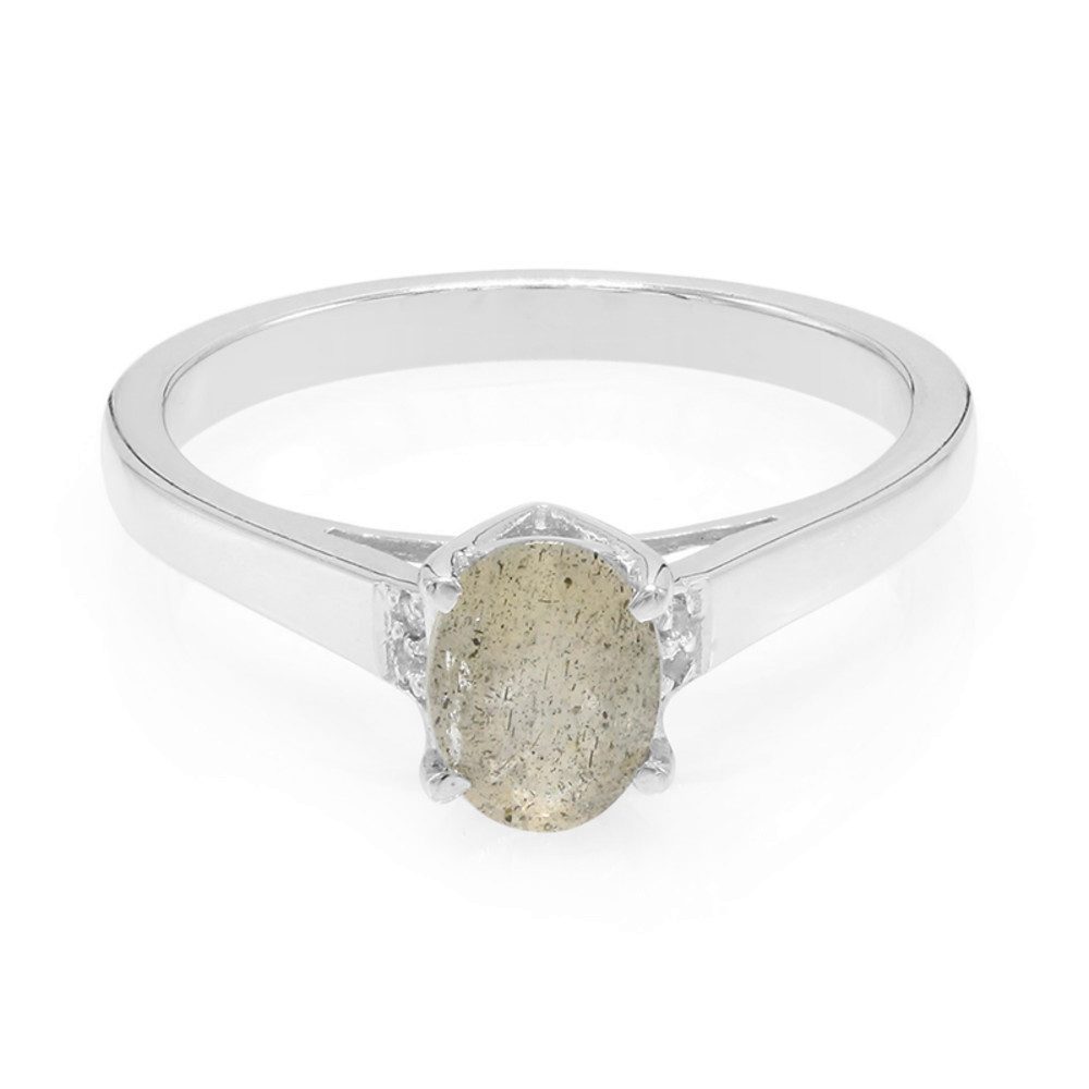 Unser Labradorit-Silberring besticht durch einen hochwertigen oval geschliffenen Labradorit (0,69 ct) aus Madagaskar, meisterhaft gefasst in ein schlankes Band aus 925er Sterlingsilber. Dieser Ring spricht sowohl Neu-Einsteiger in die Welt des Edelstahlschmucks als auch erfahrene Schmuckliebhaber an. Die faszinierenden Grautöne und das mystische Schimmern des Labradorits werden durch funkelnde weiße Topase aus Brasilien sanft betont, wodurch das Schmuckstück zu einem eleganten Hingucker wird. Perfekt zu legeren Outfits für den Alltag oder auch zu eleganter Abendgarderobe – dieser Ring verleiht jedem Look eine moderne Note voller Raffinesse und Stil.