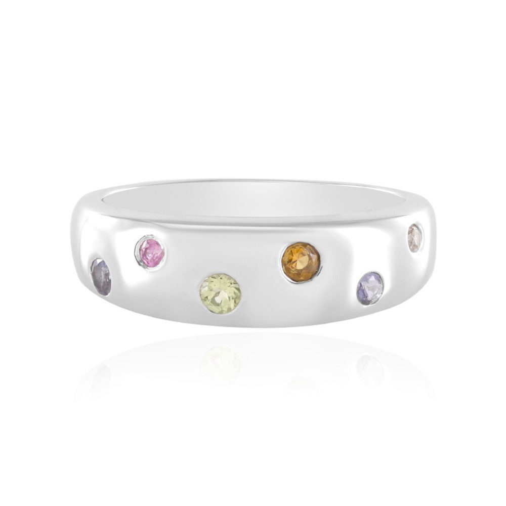 Unser eleganter Edelstein-Silberring ist ein perfektes Einsteigerstück für alle, die die Vielfalt farbiger Edelsteine lieben. Die sorgfältig ausgewählten Iolithe aus Madagaskar, Peridots aus China, Citrine aus Brasilien sowie pinkfarbene Saphire und funkelnde Zirkone werden in feinstem 925er Sterling Silber mit einer Platinbeschichtung kunstvoll eingefasst. Für erfahrene Liebhaber von Edelsteinschmuck offenbart dieser Ring eine harmonische Mischung aus runden Schliffen und lebendigen Farben, die das Handgelenk auf besondere Weise schmücken. Kombinieren Sie ihn sowohl zu legeren Alltagsoutfits als auch zu eleganten Abendveranstaltungen, um ein stilvolles Highlight zu setzen.