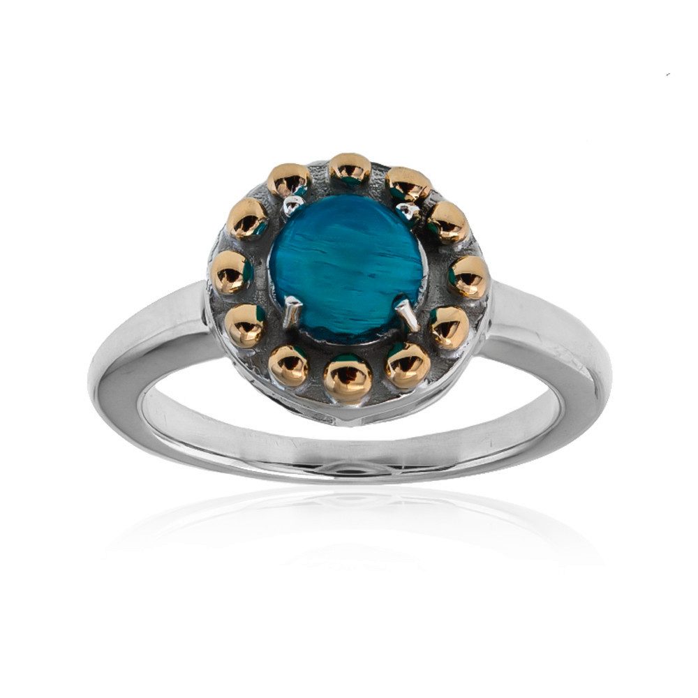 Dieser äthiopische Blaue Opal-Silberring mit Gold (Granulieren) ist ein faszinierendes Highlight für alle, die unverwechselbare Schmuckstücke suchen. Neu in der Welt der Edelsteine? Der lebendige, runde Opal aus Äthiopien besticht durch seine intensive blaue Farbe und ist meisterhaft in Sterling Silber gefasst, das mit funkelnden 14-Karat-Gold-Granulaten veredelt ist. Für erfahrene Schmuckliebhaber bietet dieser Ring eine harmonische Kombination aus hochwertigen Materialien und detailverliebtem Design. Er ist ideal für elegante Abendveranstaltungen sowie den stilvollen Alltag, lässt sich perfekt zu Business-Outfits oder festlicher Kleidung kombinieren und wertet jedes Erscheinungsbild mit seiner modernen, zeitlosen Aura auf.