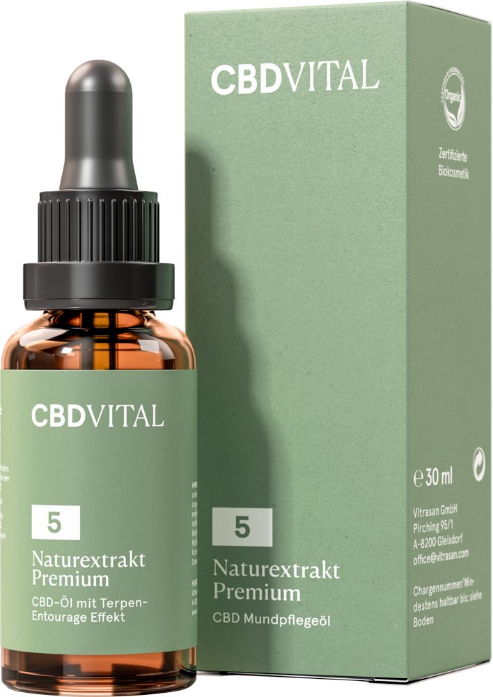 Das Naturextrakt Premium CBD Öl 5% wirkt auf der Mundschleimhaut und spendet so direkt die intensive Kraft der Hanfpflanze. Durch das synergistische Zusammenspiel zwischen CBD-reichem Hanfblätterextrakt und Bio-Hanfsamenöl sind optimale Effekte und eine maximale Verträglichkeit bei höchster Reinheit gegeben. Das CBD VITAL Naturextrakt Premium Öl beinhaltet ausschließlich natürliches (organisches) Cannabidiol. Es wird kein künstliches, synthetisches CBD zugesetzt, was bei vielen CBD-Produkten der Fall ist. Vitamin E schützt Zellen vor oxidativen Stress. Besonders hochwertig, ohne unnötige Zusatz- und Konservierungsstoffe.