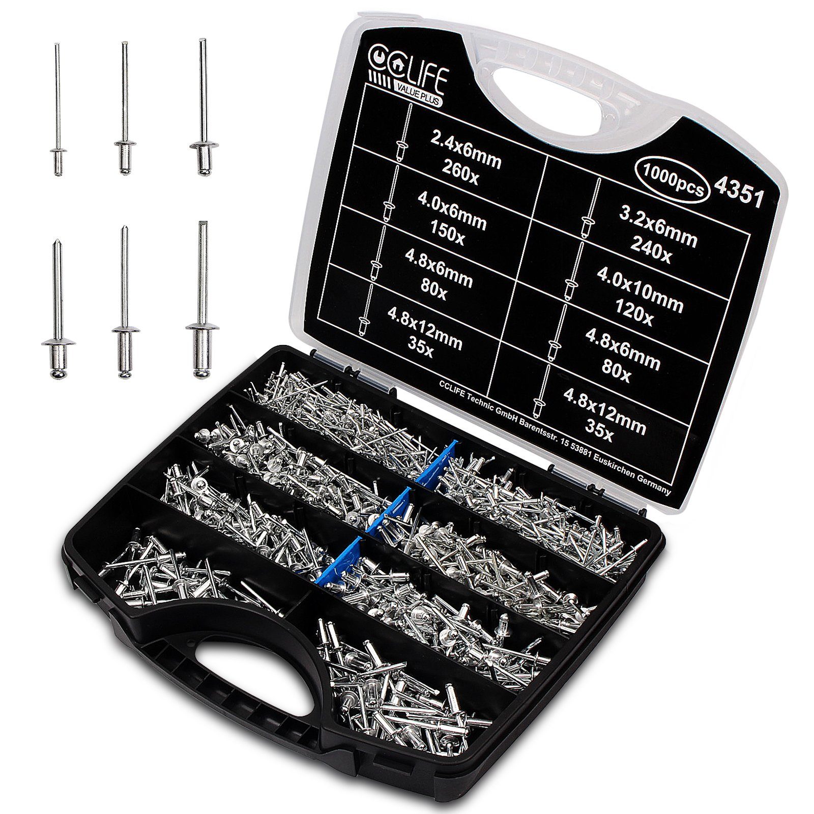Inhalt: Das Produkt enthält 1000 Nieten, 260 x 2,4 x 6mm, 240 x 3,2 x 6mm, 150 x 4,0 x 6mm, 120 x 4,0 x 10mm, 160 x 4,8 x 6mm, 70 x 4,8 x 12mm, eine Vielzahl von Größen, die den Anf