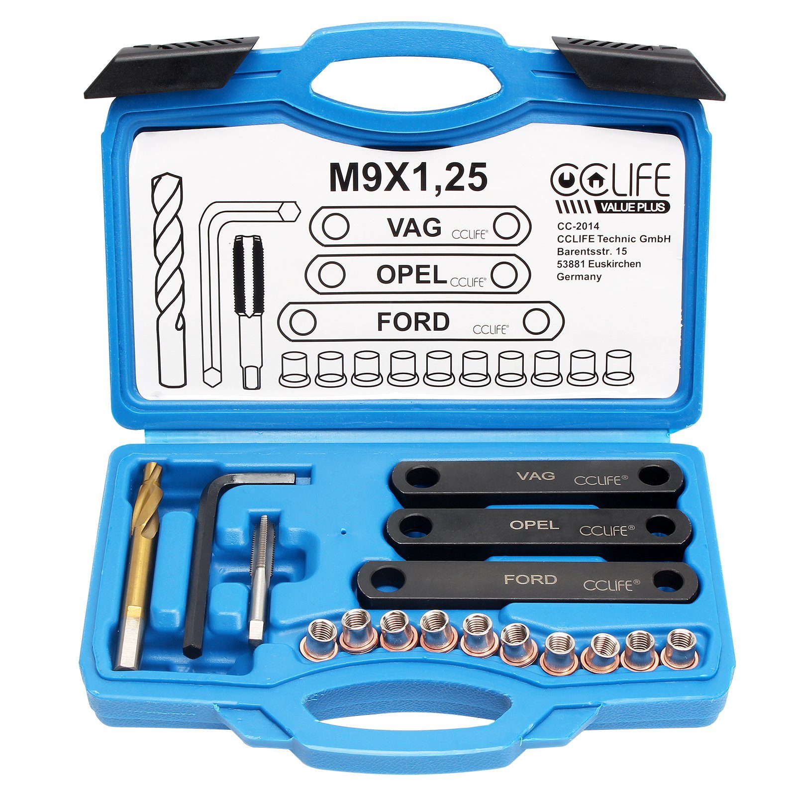 Lieferumfang: 10 Ersatz-Gewindebuchsen 1 Stufenbohrer 1 Gewindebohrer 1 Winkelschlüssel 1 Bohrlehre für VAG, 91 mm 1 Bohrlehre für Opel, 94 mm 1 Bohrlehre für Ford, 105 mm