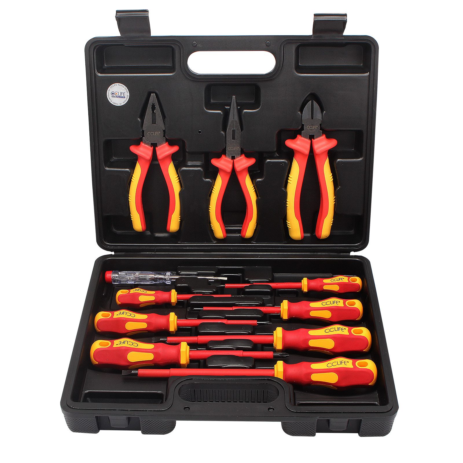 Lieferumfang | - 4 Schlitzschraubendreher: 0,6x3,5x 100 mm, 0,8x4,0 x 100 mm, 1,0x5,5 x 125 mm, 1,2x6,5 x 150 mm.- 3 Philips-Schraubendreher: PH0 X 75 mm, PH1 x 100 mm, PH2 x 100 mm.- 140mm Spannung Test-Schraubendreher mit Pocket Clip- 15,2 cm VDE-Seitenschneider- 15,2 cm VDE lange Nase Zange- 15,2 cm VDE-Kombinationszange |