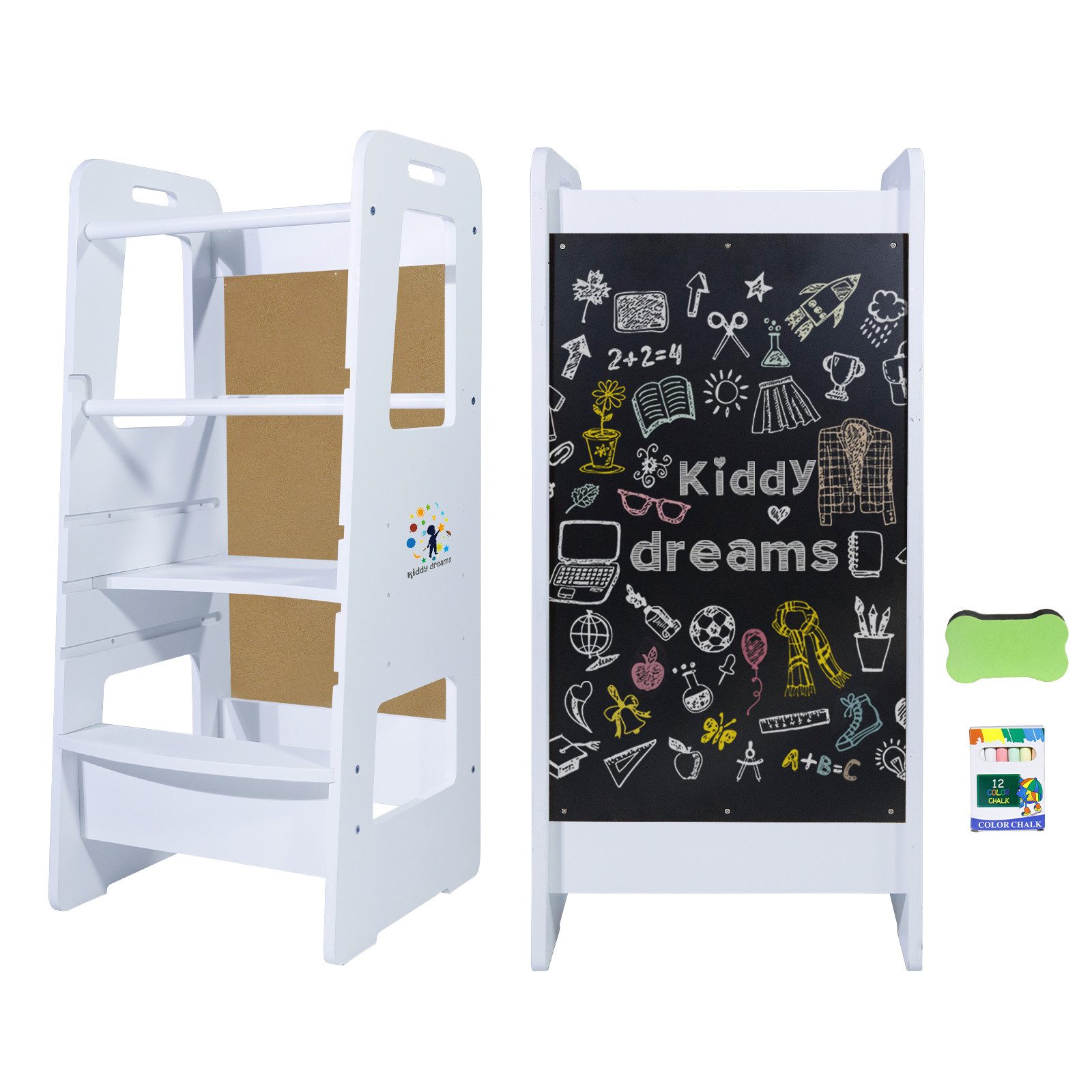 Produktgröße: 50x40x92cm Produktmaterial: Sperrholz + Kiefer (Holzstab) Oberflächenbehandlung: Lack Tafel größe: 65x37x0,3cm, mit Tafelradierer (7x4cm), 12 Farben Kreide Plattformhöhe: Der erste Stock ist 31,5 cm über dem Boden, der zweite Stock ist 39,5 cm über dem Boden und der dritte Stock ist 47,5 cm über dem Boden Die Stufe ist 21cm über dem Boden Maximale Belastung: 100kg