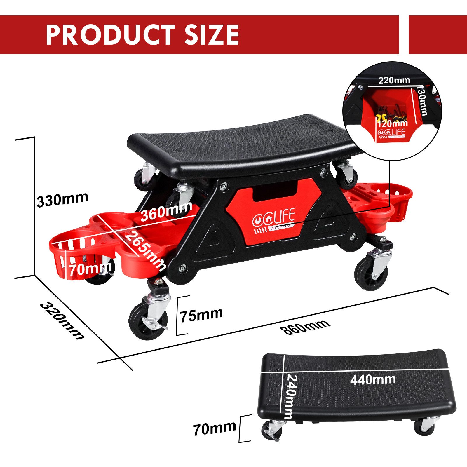 Die Werkstatt Rollsitz betragen 86×32×33cm, die abnehmbare Sitzfläche misst 44×24×12cm und er besteht aus PP- und Eisenmaterialien, die eine stabile Unterstützung und Langlebigkeit bieten.