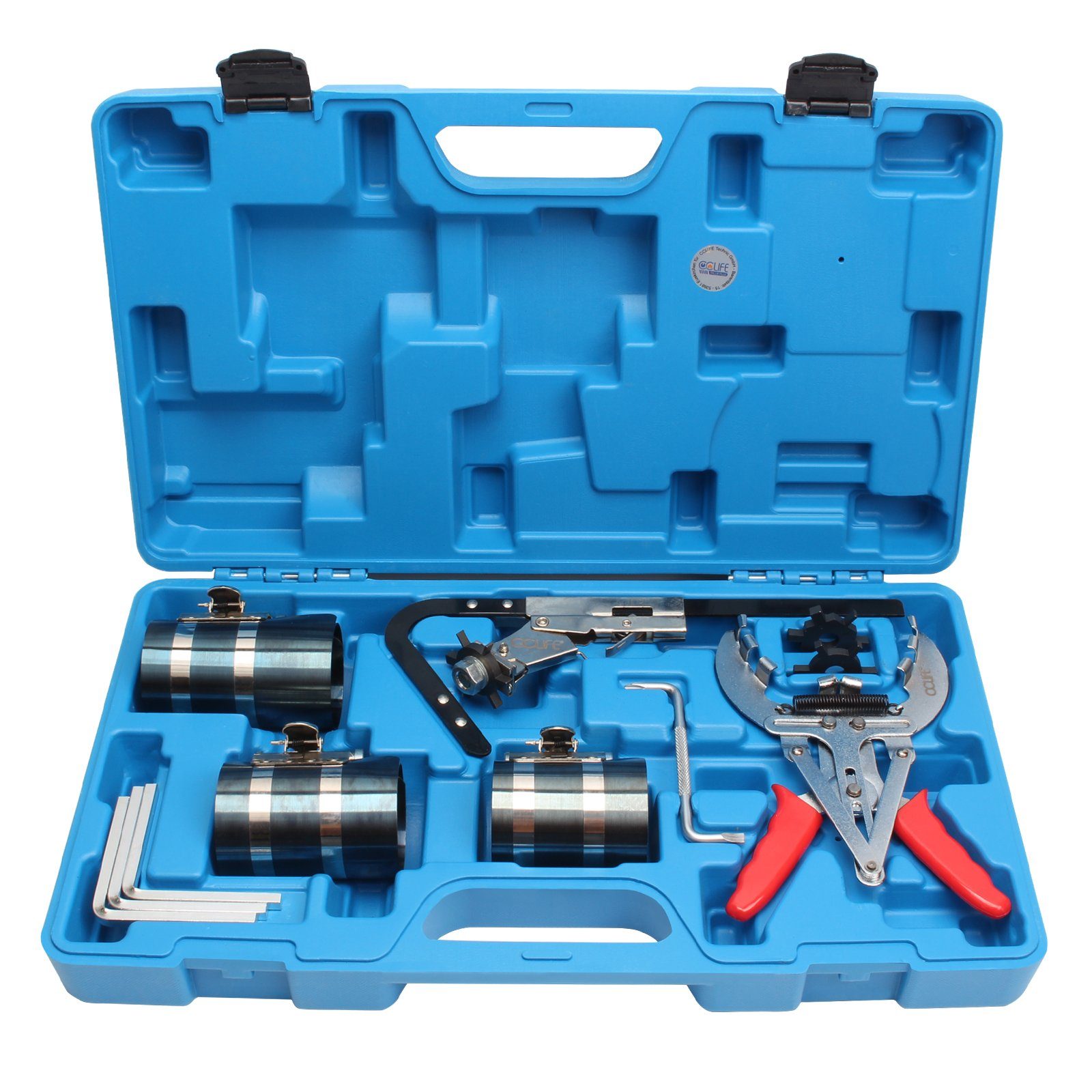 Set beinhaltet | 1x Kolbenringzange Ø 50-100 mm;1x Kolbennutreiniger; 1x Kolbenringspannband Ø 53-125 mm, Höhe ca. 75 mm; 1x Kolbenringspannband Ø 90-175 mm, Höhe ca. 90 mm; 1x Kolbenringspannband Ø 90-175 mm, Höhe ca. 100 mm |