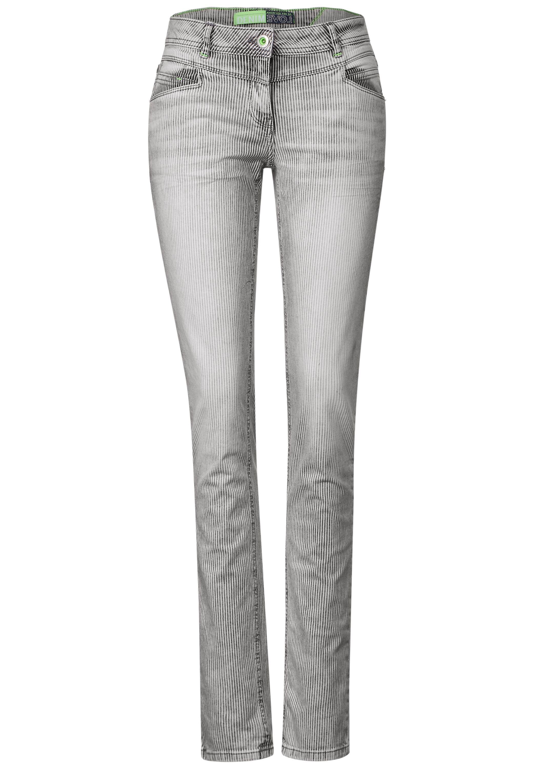 Denim look! In Loose Fit überzeugt die Damenjeans im Style Scarlett von CECIL. In Middle Waist und Slim Legs sitzt sie bequem und zaubert eine tolle Silhouette. Die graue Used Waschung bekommt durch das Streifenmuster einen modernen Look. Ein Hingucker ist der Anhänger am Bund, den man abnehmen kann. Der klassische Reißverschluss mit Knopf und der 4-Pocket Style runden den Look perfekt ab.