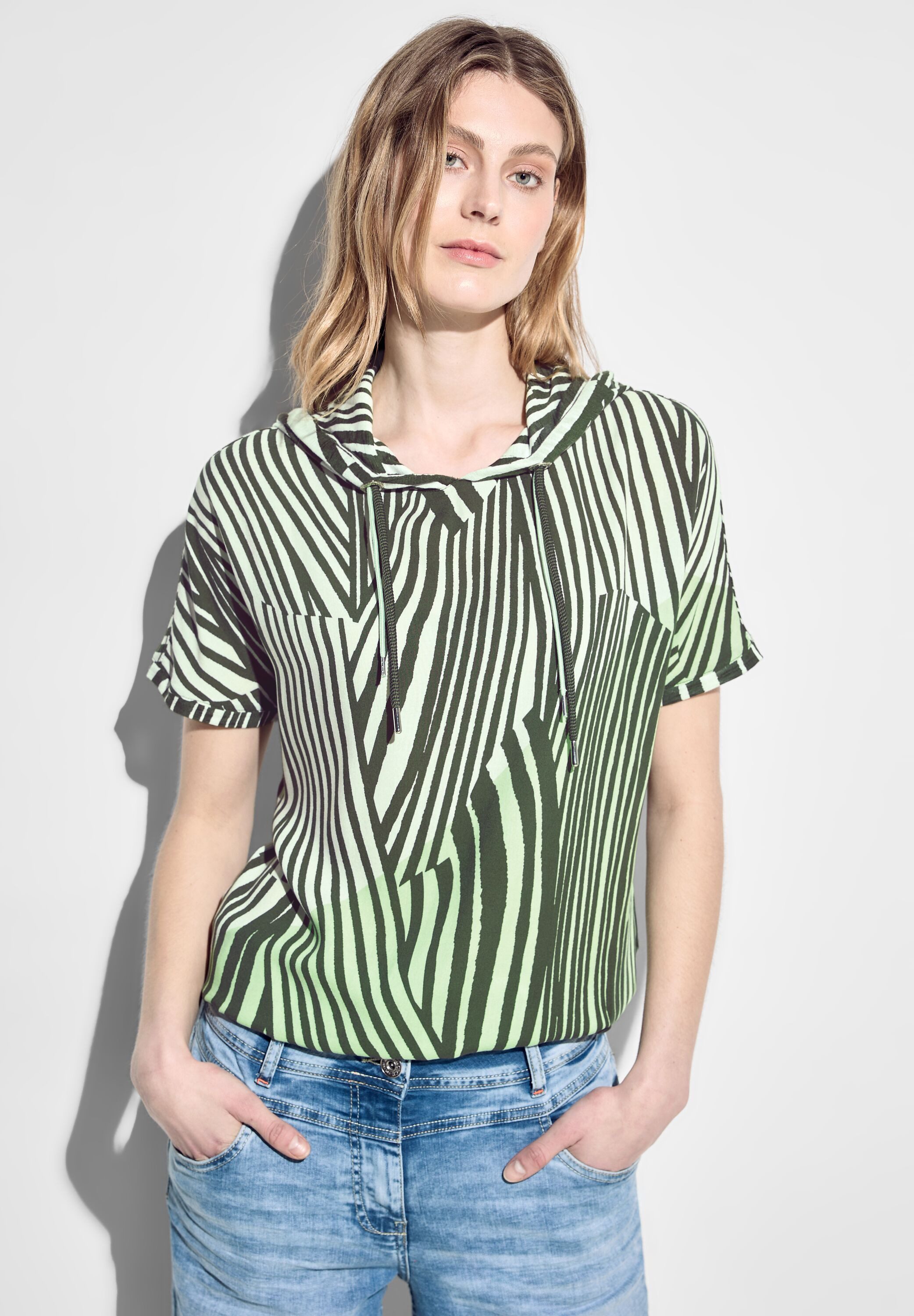 Schau dir das Kapuzenshirt von Cecil mal genauer an. Die kurzen Ärmel enden in einem Bündchen, das für guten Sitz sorgt. Dieses Shirt ist hüftlang sowie.