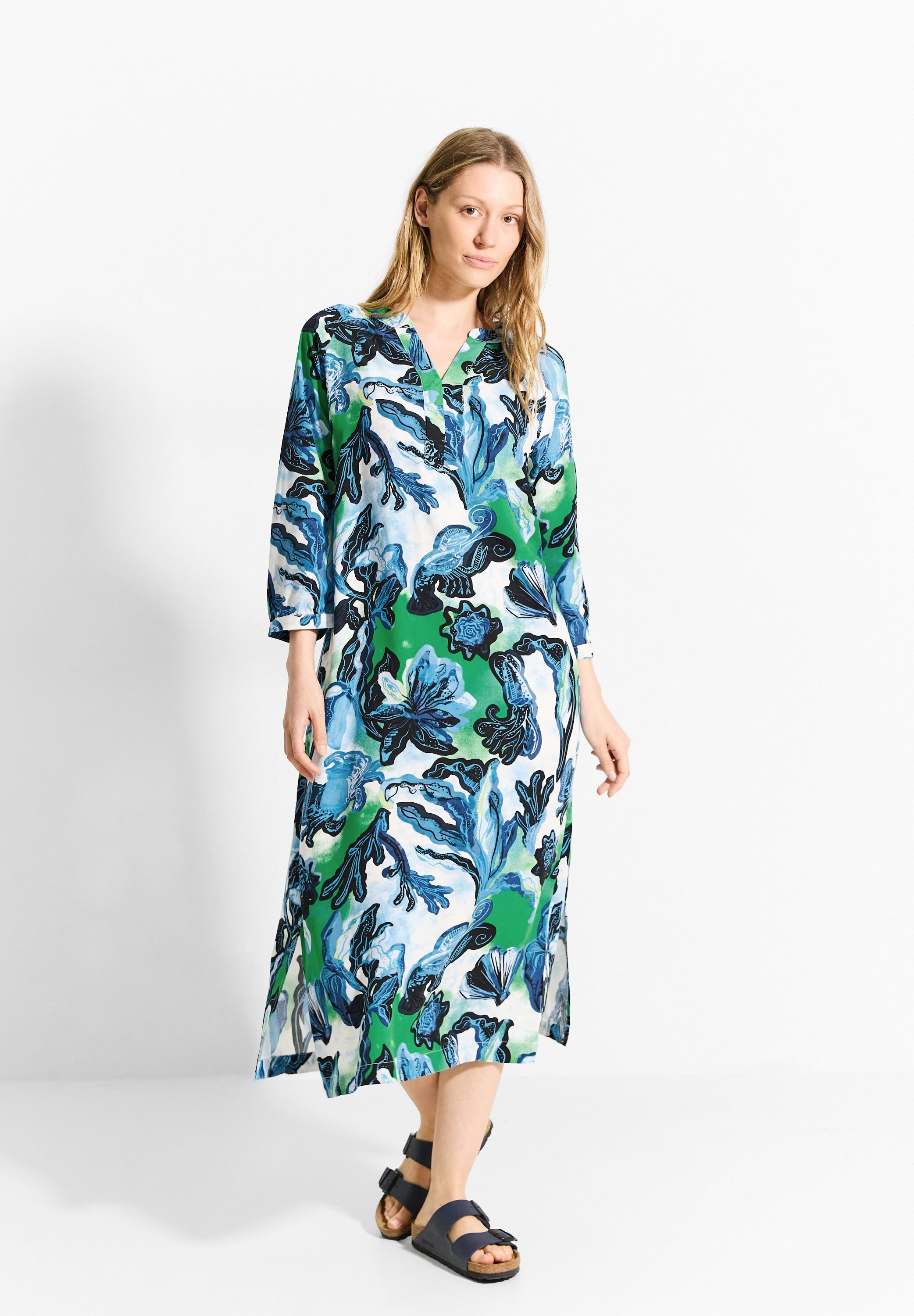 CECIL Damen Midikleid mit Print, Sommerkleid aus Viskose, geschlitzter Rundhals mit Dekoleiste, 3/4 Arm mit Bündchen und Knopf, Eingrifftaschen, seitliche Schlitze im Saum. Das Midikleid mit Print von CECIL für Damen ist ein stilvolles Sommerkleid aus Viskose mit einem geschlitzten Rundhalsausschnitt, der durch eine Dekoleiste akzentuiert wird. Die 3/4 Ärmel mit Bündchen und Knopf verleihen dem Dress eine elegante Note. Praktische Eingrifftaschen und seitliche Schlitze im Saum bieten zusätzlichen Komfort und Bewegungsfreiheit.