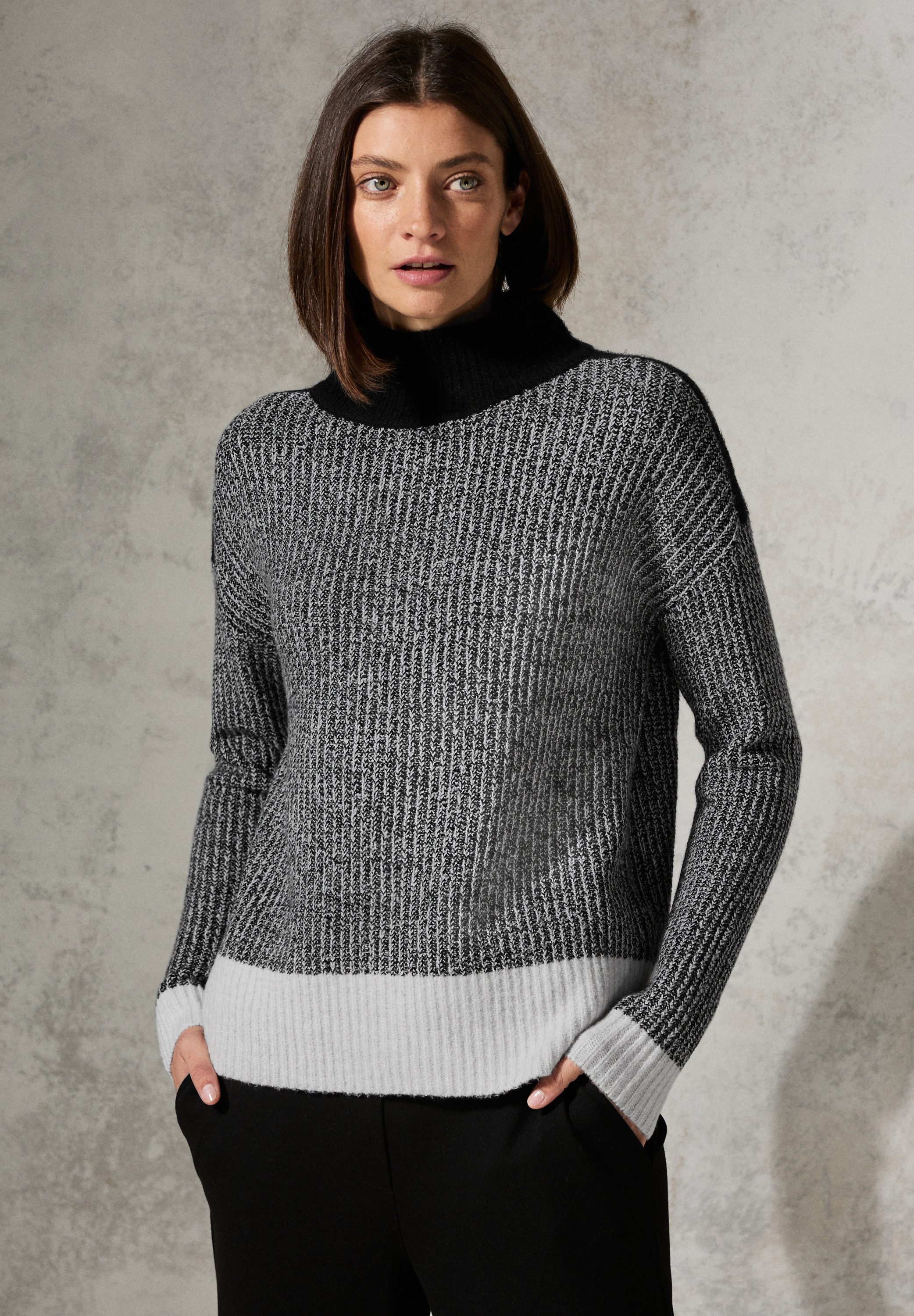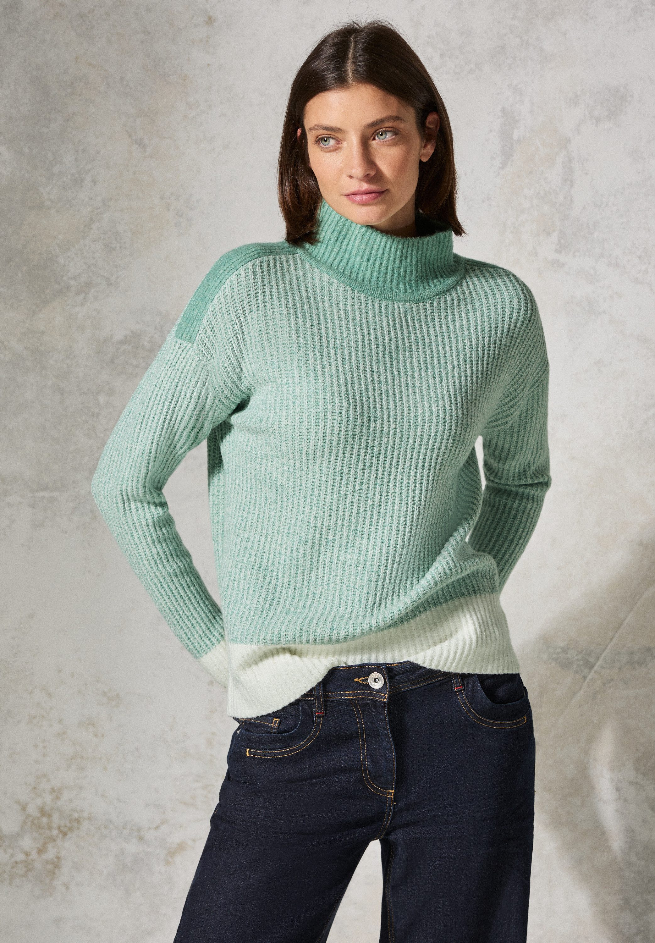 Der Mouliné Pullover von CECIL für Damen kombiniert einen trendigen Melange-Look mit einem gemütlichen Turtleneck. Langarm mit Bündchen und der weiche Baumwollmix mit Stretchanteil sorgen für hohen Tragekomfort. Ein modischer Hingucker für jeden Tag.