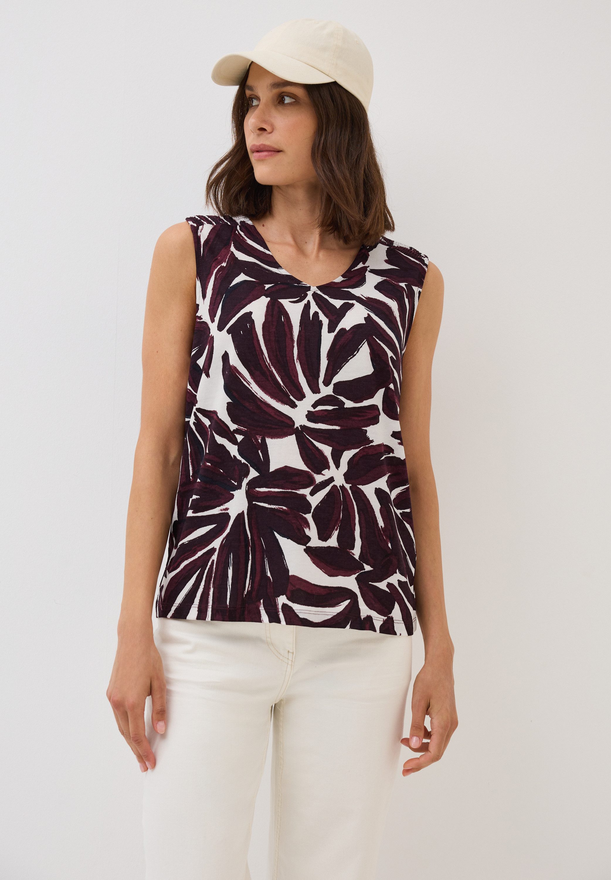 Schau dir das Shirttop von Cecil mal genauer an. Dieses Top hat einen V-Ausschnitt und ist hüftbedeckend sowie lässig geschnitten, sodass der Oberkörper locker betont wird.