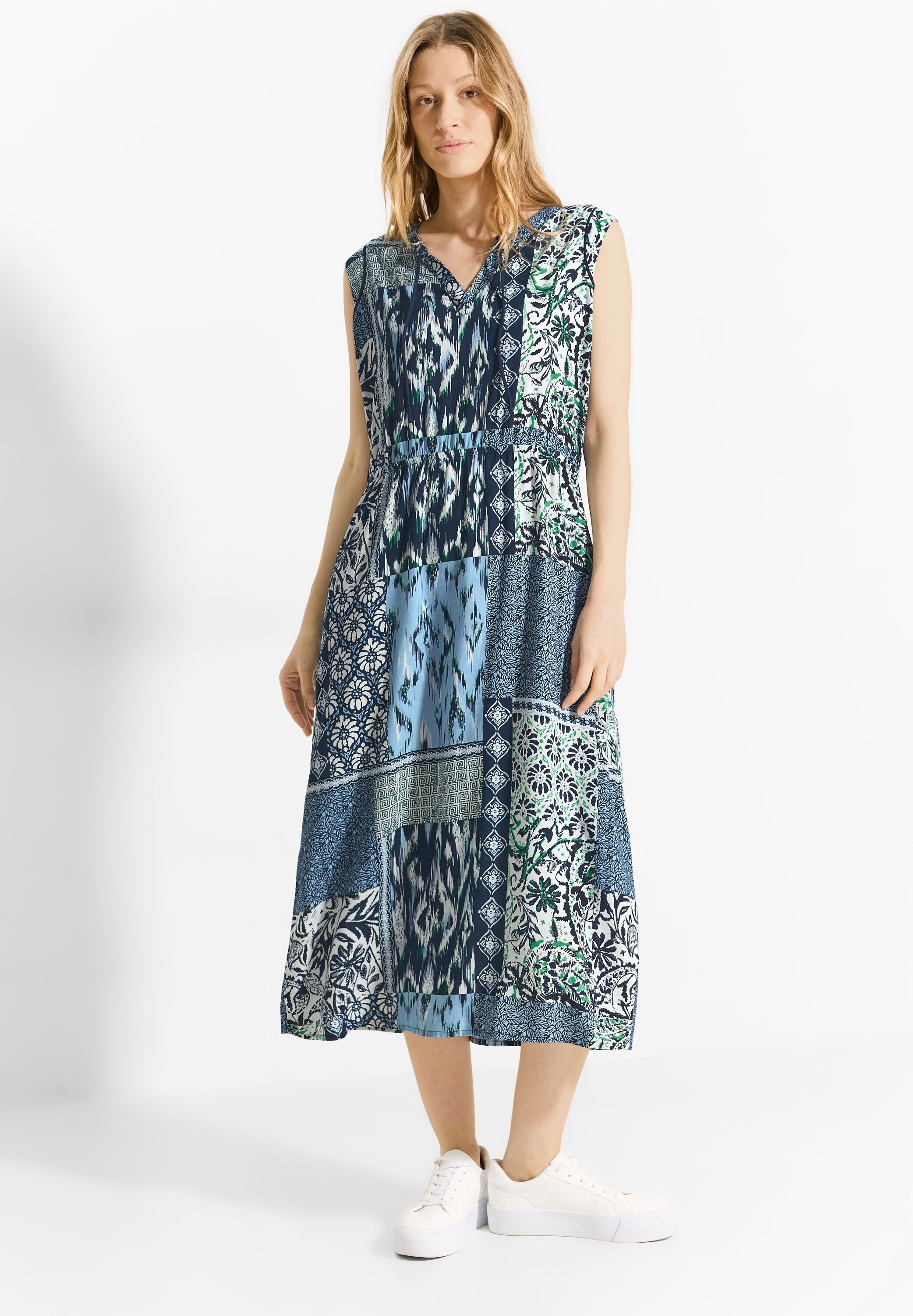 CECIL Damen Patchwork Print Sommerkleid, ärmellos, geschlitzter Rundhals mit Band, leicht tailliert, knielang, softe Viskose Qualität. Das ärmellose Patchwork Print Kleid von CECIL für Damen besticht durch seinen geschlitzten Rundhalsausschnitt mit Banddetail. Leicht tailliert an der Hüfte und knielang geschnitten, bietet es eine schmeichelhafte Passform. Hergestellt aus softer Viskose-Qualität, sorgt es für angenehmen Tragekomfort an warmen Tagen.