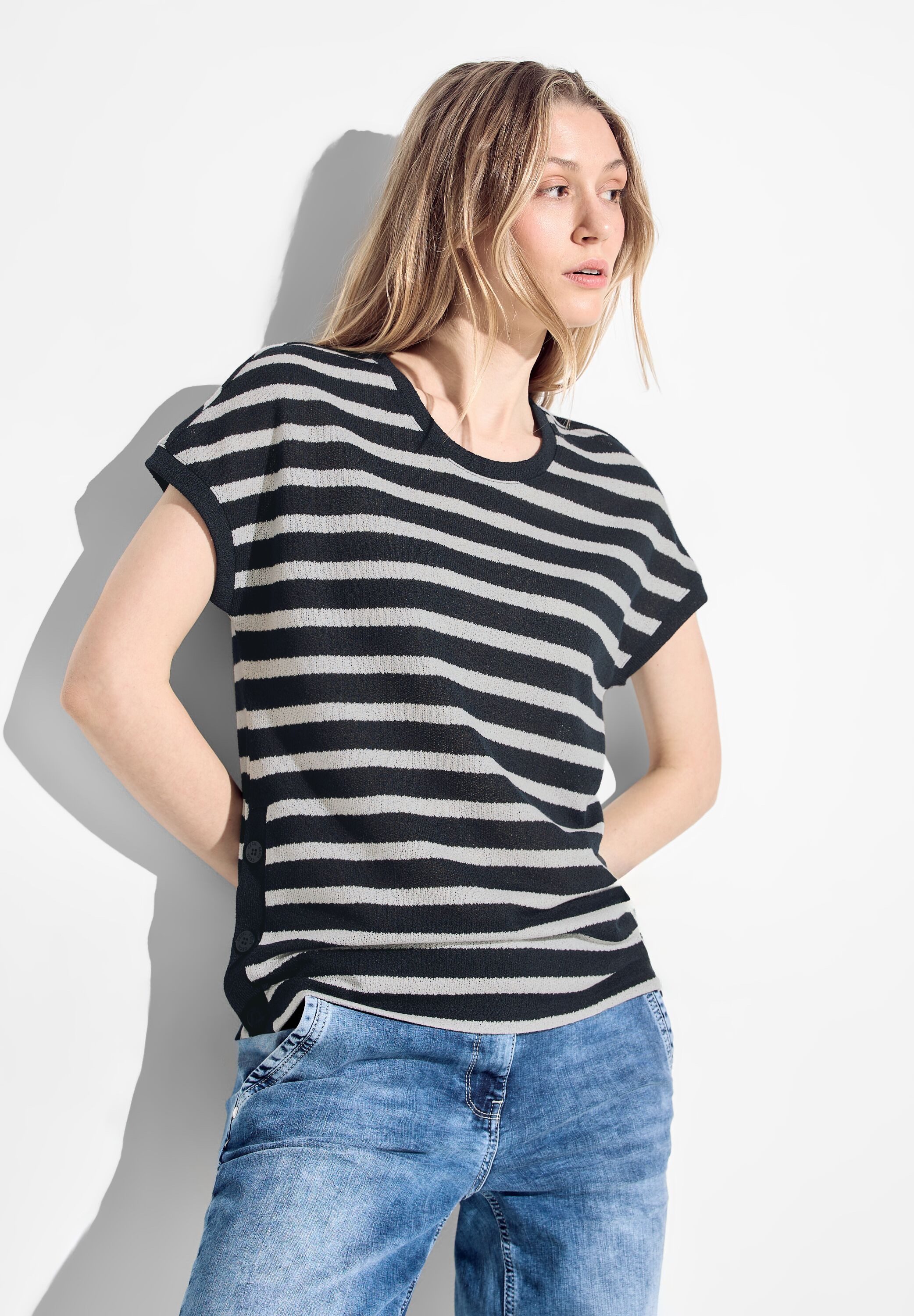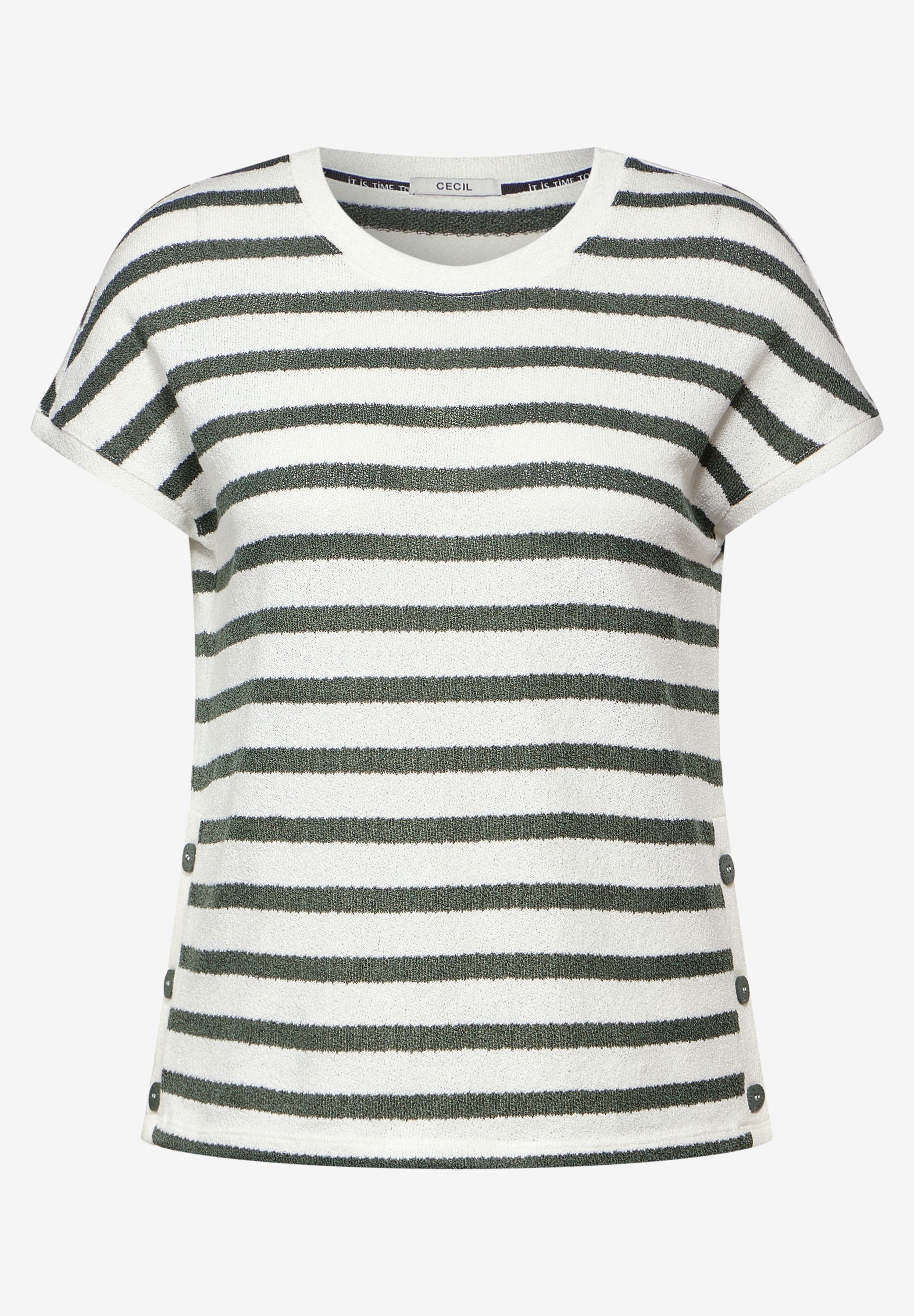 CECIL Gestreiftes T-Shirt, Kurzarmshirt, Rundhals, Crepige grobe Jerseyware, Seite mit Knopfdekoration, Kragen, Cuff und Knopfdetail in Unistoff. Das gestreifte Kurzarmshirt für Damen von CECIL präsentiert sich mit einem klassischen Rundhalsausschnitt und einer crepigen groben Jerseyware für einen modernen Look. Eine Seite ist mit Knopfdekoration versehen, während Kragen, Ärmelabschlüsse und das Knopfdetail in Unistoff gehalten sind, was dem Shirt eine raffinierte Note verleiht. Ein vielseitiges und stilvolles Kleidungsstück für jeden Anlass.