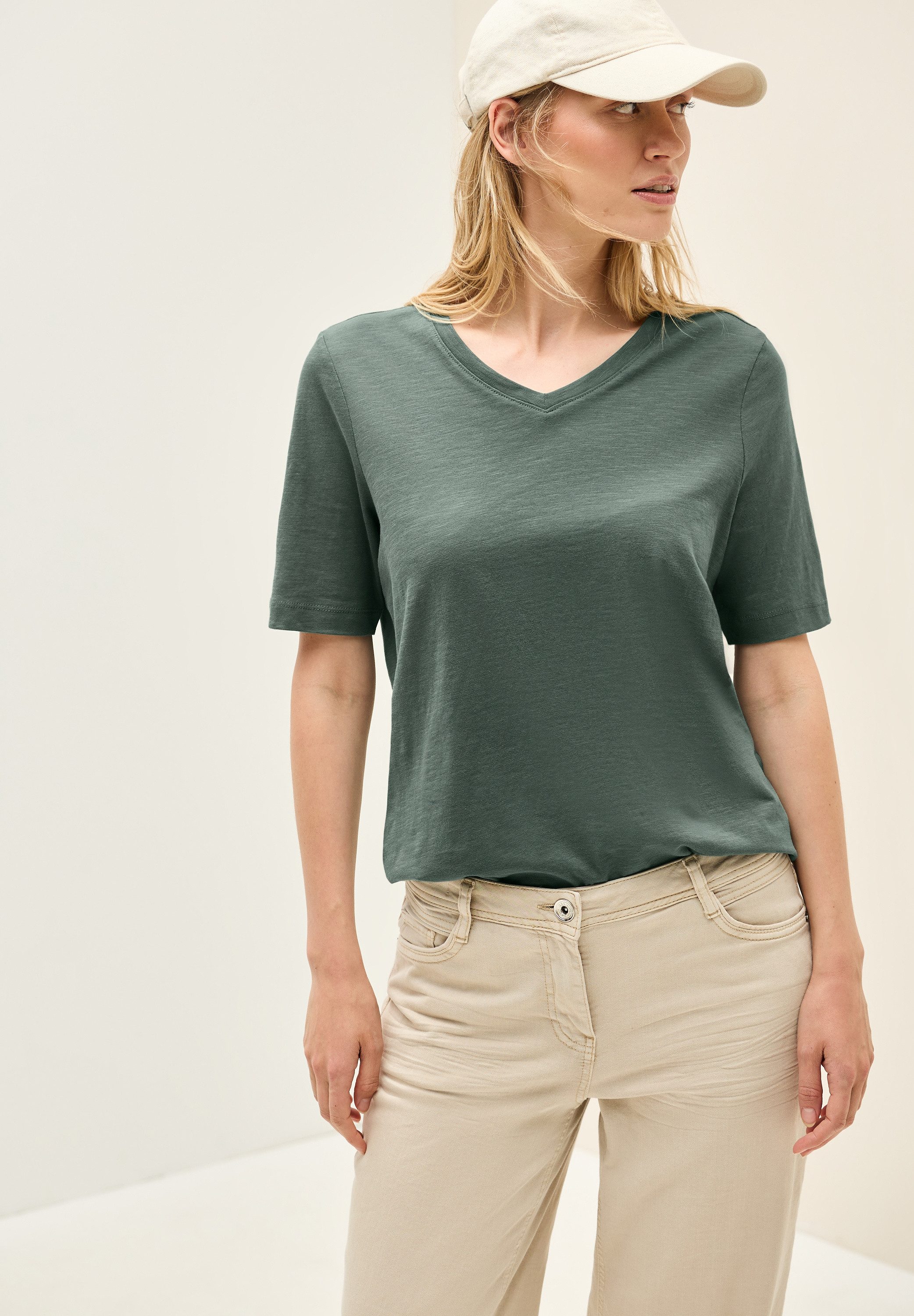 Schau dir das T-Shirt von Cecil mal genauer an. Dieses Shirt hat einen V-Ausschnitt und ist hüftbedeckend.