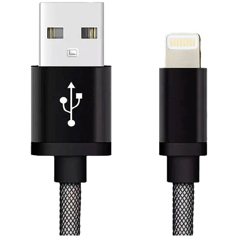 Eigenschaften | Anschluss-Typ: USB, Apple Lightning · Anschlüsse: USB-A Stecker, Apple Lightning Stecker · Herstellerfarbe: Schwarz · Kabel-Ausführung: Ladekabel · Kabel-Form: rund · Kabellänge: 1.00 m · Maximale Leistung: 12 W @ 5 V / 2.4 A · Maximale Übertragungsrate: 480 MBit/s · Spezifikation: USB 2.0 · Verbindungsart: USB-A auf Apple Lightning |