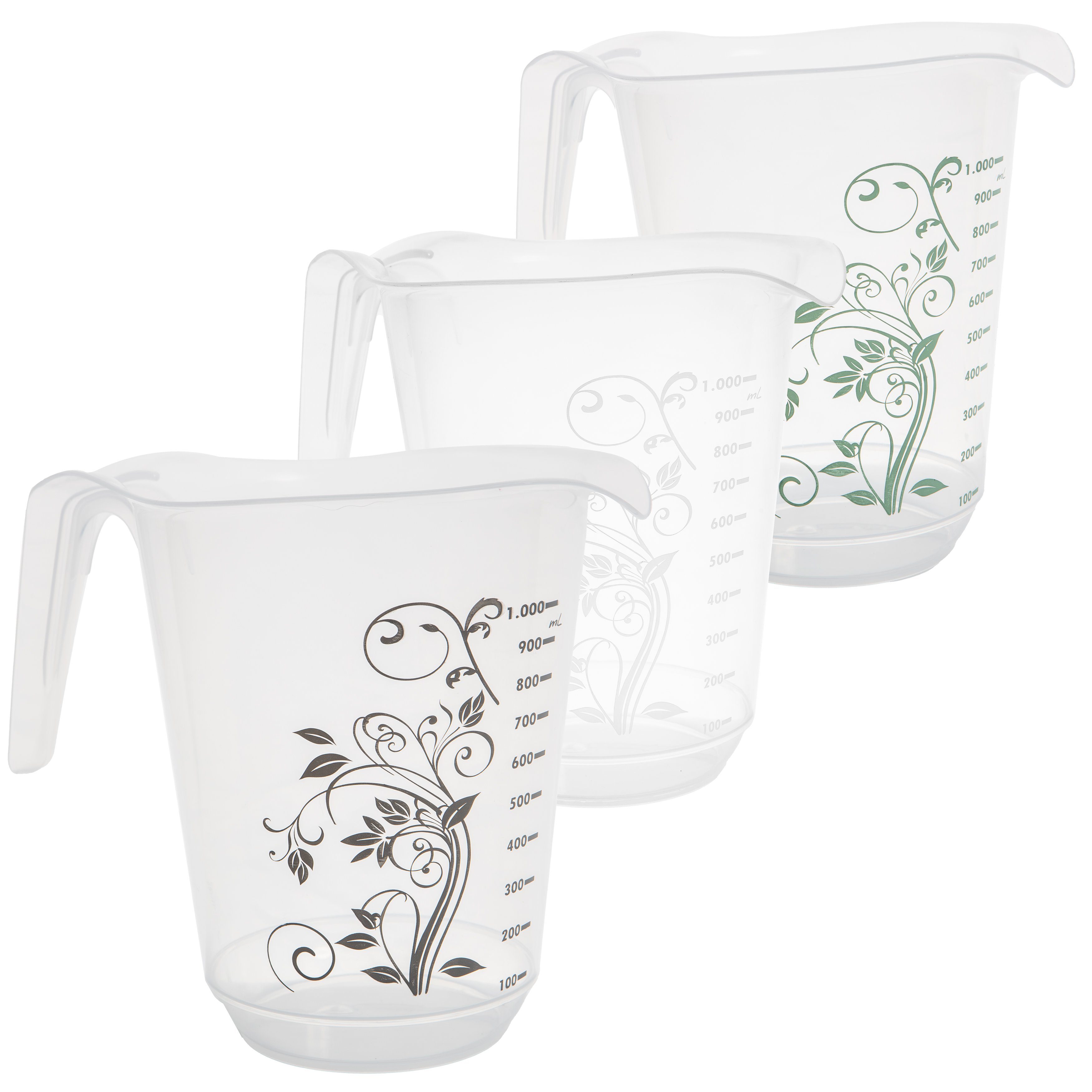 Das 3er Set Messbecher ist ein praktischer und vielseitig einsetzbarer Helfer in der Küche. Jeder Messbecher hat ein Fassungsvermögen von 1 Liter und ist aus stabilem, lebensmittelechtem Kunststoff (PS) hergestellt, der bruchsicher und langlebig ist. Mit den Maßskalen für Mehl, Zucker, Reis und Flüssigkeiten ist das Abmessen von Zutaten ein Kinderspiel. Der Messbecher ist transparent und hat ein ansprechendes Ornament in den Pastellfarben Grau, Weiß und Pastellgrau. Der Kunststoff ist glasklar und frei von jeglichen Schadstoffen, was eine sichere und hygienische Handhabung gewährleistet. Das Material ist zudem extrem langlebig und recyclebar, was für eine umweltfreundliche Entsorgung sorgt. Der Messbecher kann nach der Verwendung einfach in der Spülmaschine gereinigt werden. Die Abmessungen des Messbechers betragen einen Durchmesser von ca. 16 cm und eine Höhe von ca. 17.5cm. Die Außenmaße entsprechen somit einem Fassungsvermögen von 1 Liter. Das 3er Set Messbecher wird in der EU hergestellt und steht für eine hohe Qualität und Sicherheit in der Anwendung. Ob für das Abmessen von Zutaten beim Kochen oder Backen - das 3er Set Messbecher ist ein unverzichtbarer Helfer in jeder Küche.