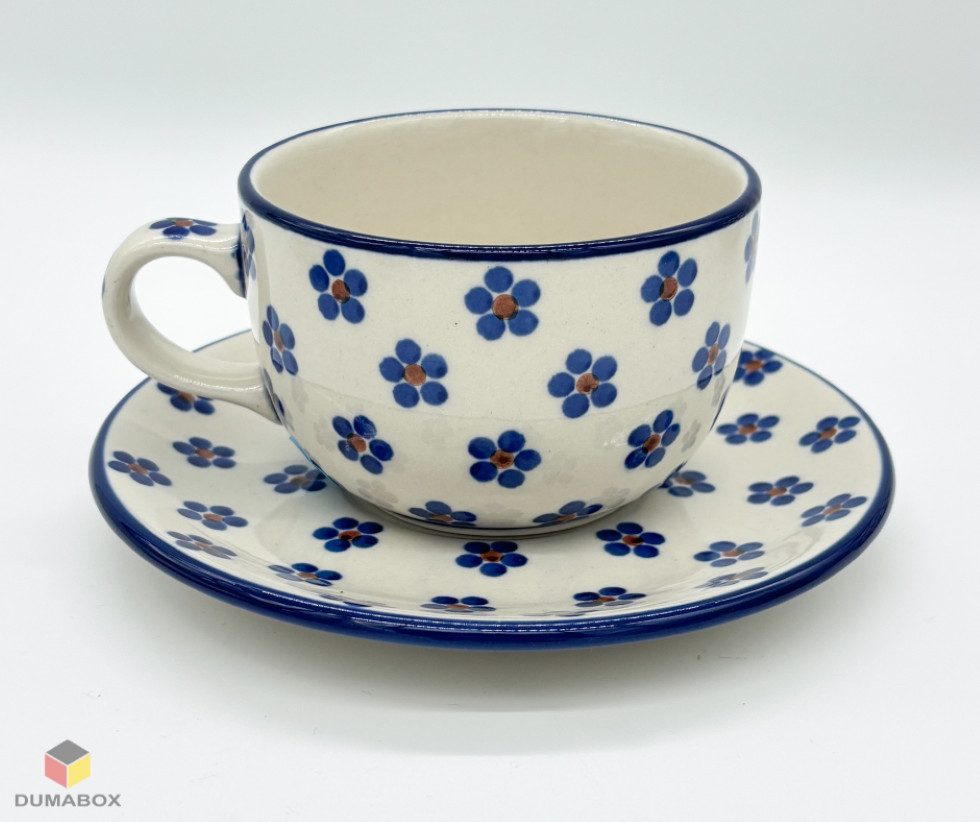 Diese Tasse mit Untertasse wurde in traditioneller Handwerkskunst in Bolesławiec (Bunzlau) hergestellt und ist handbemalt. Es handelt sich um ein Produkt in I. Wahl, was höchste Qualität garantiert. Die Tasse und der Unterteller sind nicht nur ein optisches Highlight, sondern auch funktional – sie können problemlos in der Spülmaschine, im Ofen und in der Mikrowelle verwendet werden.