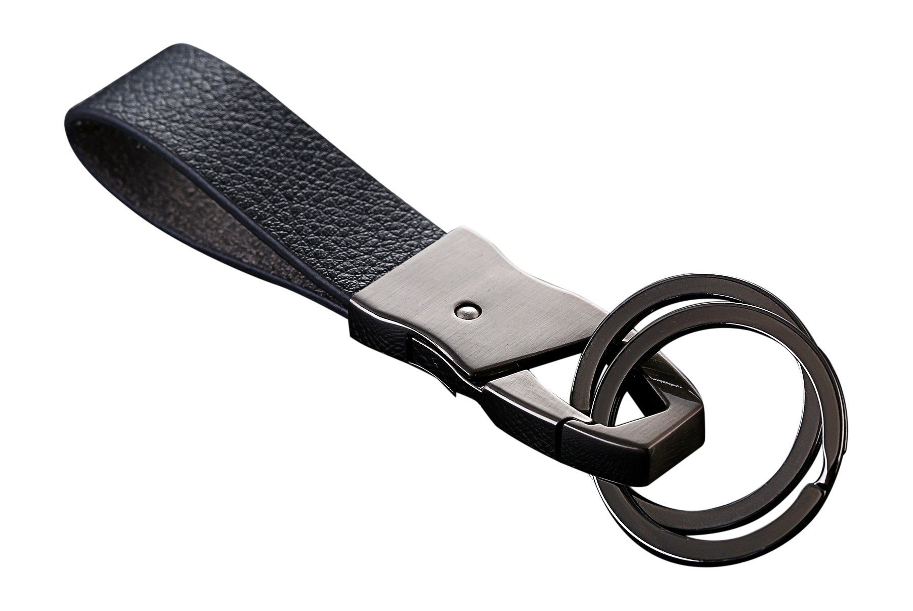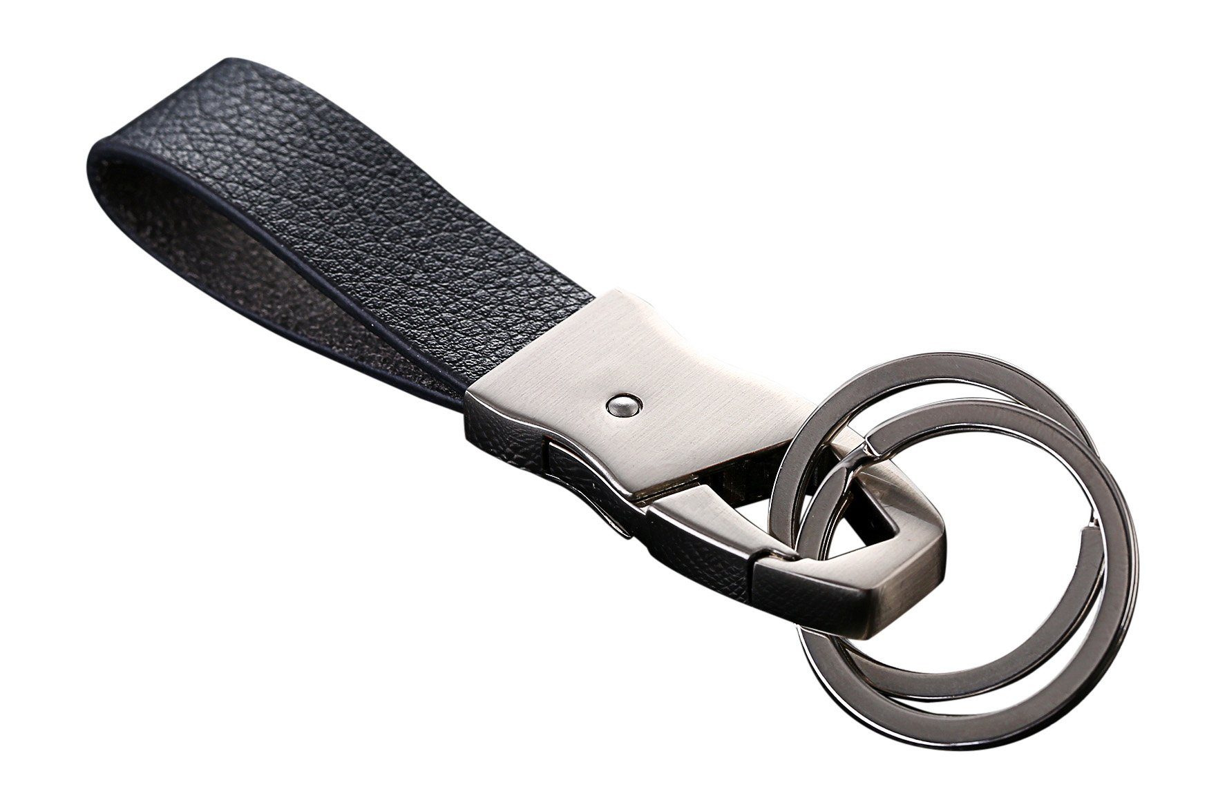 Eleganter Schlüsselanhänger mit exklusivem Design. Durch die innovative Schnalle lassen sich Schlüssel schnell und sicher anbringen sowie entnehmen. Die Schließeinheit aus Stahl, ummantelt mit einer Zinklegierung. Die Schlaufe besteht aus Kunstleder. Der Anhänger ist dadurch widerstandsfähiger gegen Kratzer. Das Schlüsselband wird in einer edlen Geschenkbox geliefert und ist das perfekte Geschenk. Ideal für Autoschlüssel, Hausschlüssel und Wohnungsschlüssel. Maße: ca. 10,2 cm x 2,4 cm x 1,9 cm (Breite x Höhe x Tiefe). Gewicht: ca. 34 g. Der Schlüsselbund besitzt keine Gravur. Lieferumfang: Schlüsselanhänger mit 2 Schlüsselringen. Eingepackt in einer schönen Geschenkverpackung.