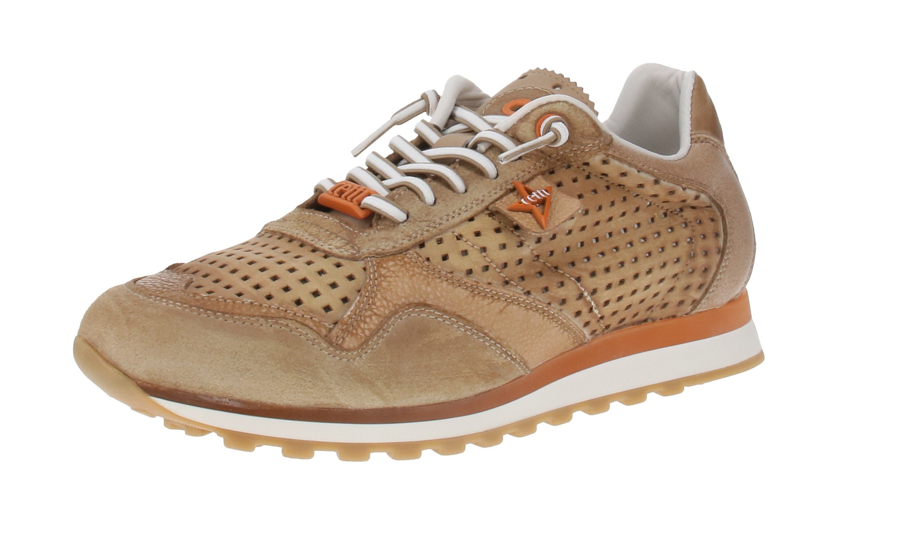 Die Schuhe der Marke Cetti sind aus Naturprodukten und handgearbeitet. Die Materielien sind handgezwickt, handgenäht und von Hand eingefärbt. Durch dieses Verfahren entstehen Abweichungen in Farbe und Struktur, die den Modellen einen einzigartigen Used-Look verpassen. Damit dieser Look lange erhalten bleibt, sollte der Schuh vor dem ersten Tragen imprägniert werden. Zu den Besonderheiten zählen außerdem die Cut-Outs im Obermaterial, der elastische Schnürverschluss und das wechselbare Lederfußbett.