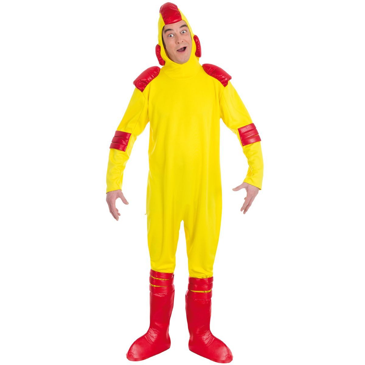 Der leuchtend gelbe Anzug aus strapazierfähigem Polyesterstoff ist mit roten Applikationen an Schultern, Armen und Beinen verziert. Die Kapuze ist am Einteiler befestigt und passt perfekt zum Anzug. Der Look wird durch ein Paar rote Überziehschuhe abgerundet, die Ihre Straßenschuhe verdecken. Das Kostüm ist eine Einheitsgröße und wird für eine Körpergröße von bis zu 1,85 Metern empfohlen.