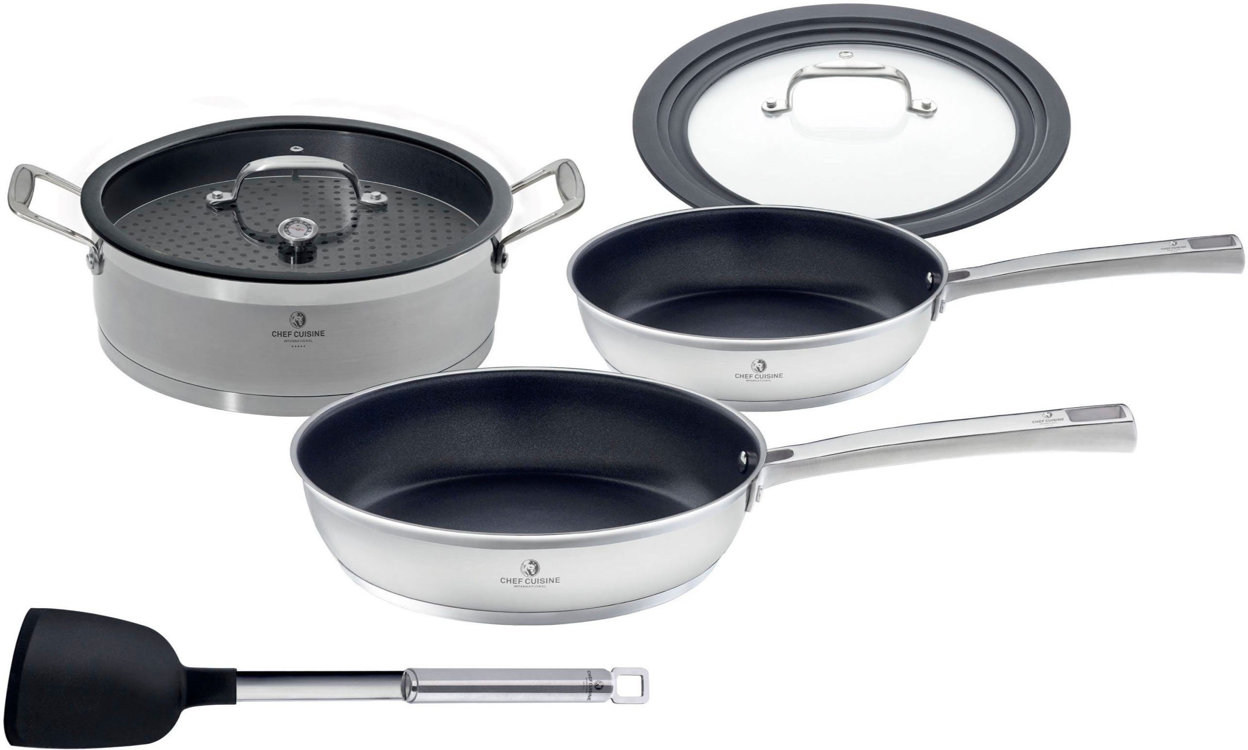 Das vielseitige Pfannen Set von CHEF CUISINE, bestehend aus Aromadampfgarer, zwei Bratpfannen, Universal-Glasdeckel und gratis Pfannenwender, ist die perfekte Ergänzung für jede Küche. Entwickelt für höchste Ansprüche im Alltag, überzeugt das Set mit einer langlebigen Antihaft-Beschichtung aus Original TEFLON™, die ein müheloses Braten ohne Anhaften garantiert. Die beiden Bratpfannen in Ø 24 cm und Ø 28 cm sowie der Aromadampfgarer / Servierpfanne Ø 28 cm bieten flexible Einsatzmöglichkeiten – von saftigem Fleisch bis zu schonend gegartem Gemüse. Dank des robusten und rostfreien Edelstahlkörpers und des gekapselten Bodens mit Aluminiumkern genießen Sie optimale Wärmeleitung und langanhaltende Wärmespeicherung für energieeffizientes Kochen. Der Aromadampfgarer besitzt zusätzlich ein Ablagerost mit Silikonauflage für feineres Gargut und eignet sich auch hervorragend als Servierpfanne. Der bruchsichere Universal-Glasdeckel mit breitem Silikonrand und Dampföffnung passt auf Pfannen und Töpfe mit Ø 24–28 cm. Hitzebeständig bis 180 °C sorgt er für optimale Kontrolle und Sicherheit beim Kochen. Все Pfannen und der Dampfgarer sind hitzebeständig bis zu 260° C und so für alle Herdarten geeignet, inklusive Induktion und sogar backofengeeignet – ideal für vielseitige Kochtechniken. Komfort und Ergonomie stehen im Mittelpunkt: Ergonomische und genietete Edelstahlgriffe, sowie der sowie der Schüttrand sorgen für ein tropffreies Ausgießen und sicheres Handling. Der beiliegende Pfannenwender mit hitzebeständigem Silikonkopf (bis 260 °C) und einer Длина von 36 cm ergänzt das Set perfekt und schont empfindliche Beschichtungen. Er eignet sich ideal zum Wenden, Heben und Teilen in beschichteten Töpfen und Pfannen. Gefertigt aus rostfreiem, hygienischem Edelstahl ist das Set nicht nur extrem langlebig, sondern auch pflegeleicht, hygienisch und geschmacksneutral. Die Reinigung kann bequem in der Spülmaschine erfolgen, wobei eine schonende Handwäsche empfohlen wird, um die Qualität langfristig zu erhalten. Mit diesem 4-teiligen Pfannen Set inklusive Zubehör bringst du Profi-Qualität in deine Küche – für unvergessliche Kochmomente jeden Tag.