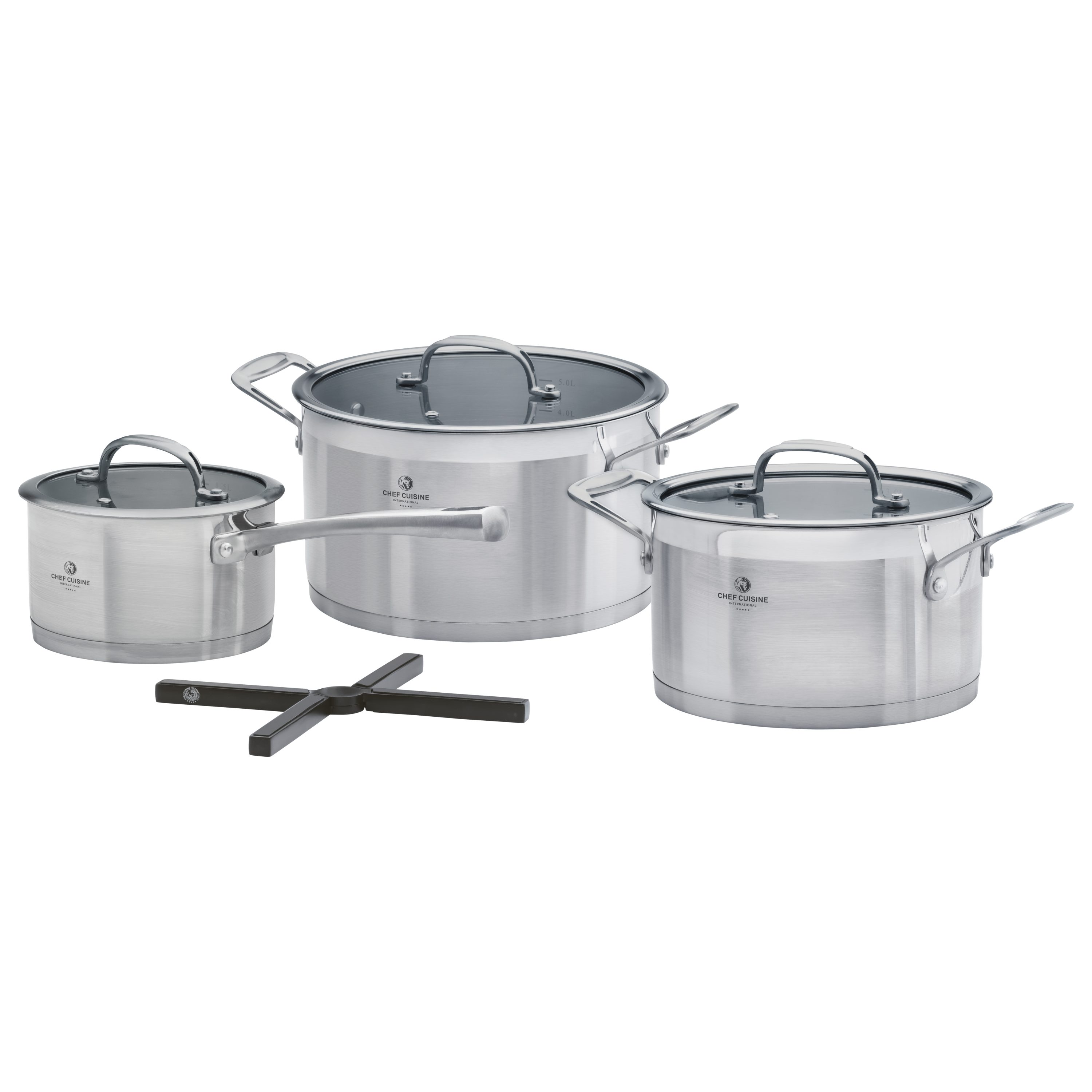 Entdecke das umfassende Topfset, bestehend aus einer Stielkasserolle Ø 16 und zwei Kochtöpfen in den Größen Ø 20 und Ø 24 cm, jeweils mit praktischen Glasdeckeln ausgestattet. Als besonderes Highlight erhältst du in diesem Set einen hochwertigen Topfuntersetzer gratis dazu. Dieses Set bietet dir die perfekte Grundlage für die Zubereitung einer Vielzahl von Gerichten, von Suppen und Saucen bis hin zu umfangreichen Eintöpfen.