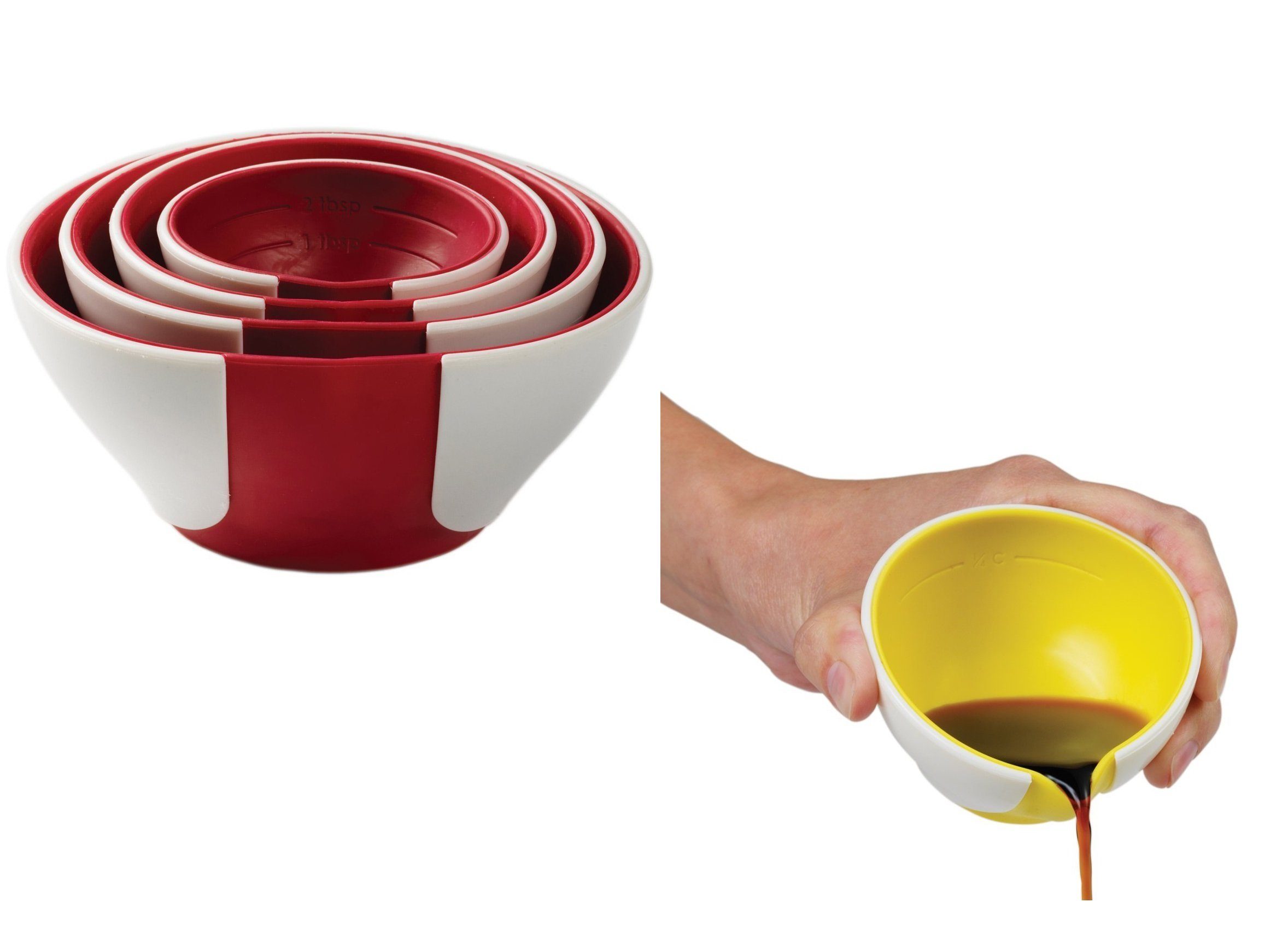 Mit den stapelbaren Messbechern haben Sie auch dann immer eine ideale Auswahl an Behältern mit Skala parat, wenn ihre Küche nur wenig Platz bietet. Die Messbecher lassen sich nämlich einfach übereinanderstapeln und beanspruchen so ein Minimum an Platz im Küchenschrank. Zudem besitzen sie flexible Tüllen, die sich je nach Anwendungssituation durch Druck vergrößern oder verkleinern lassen.