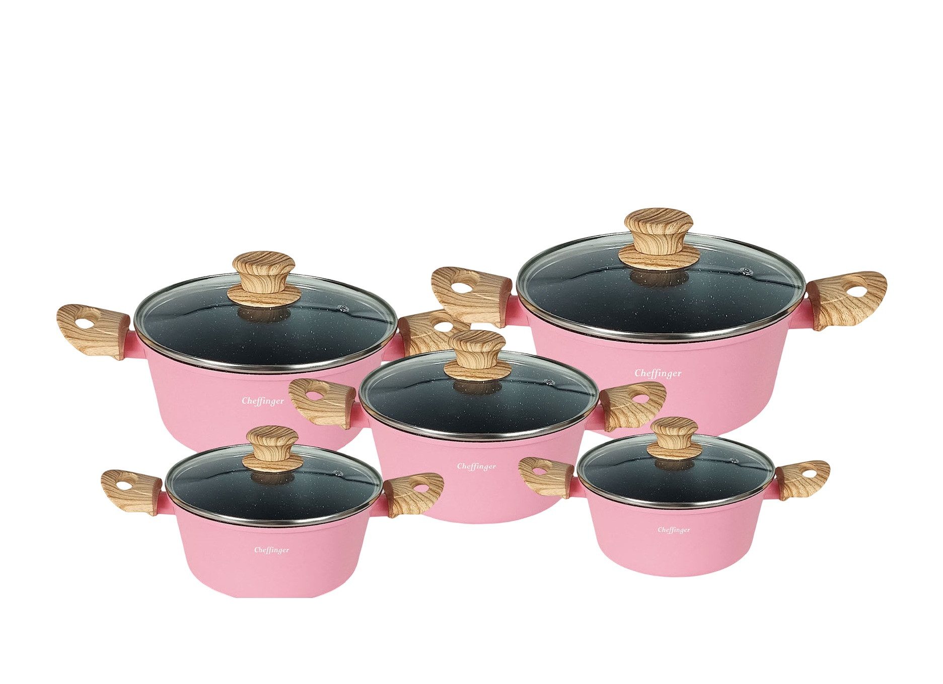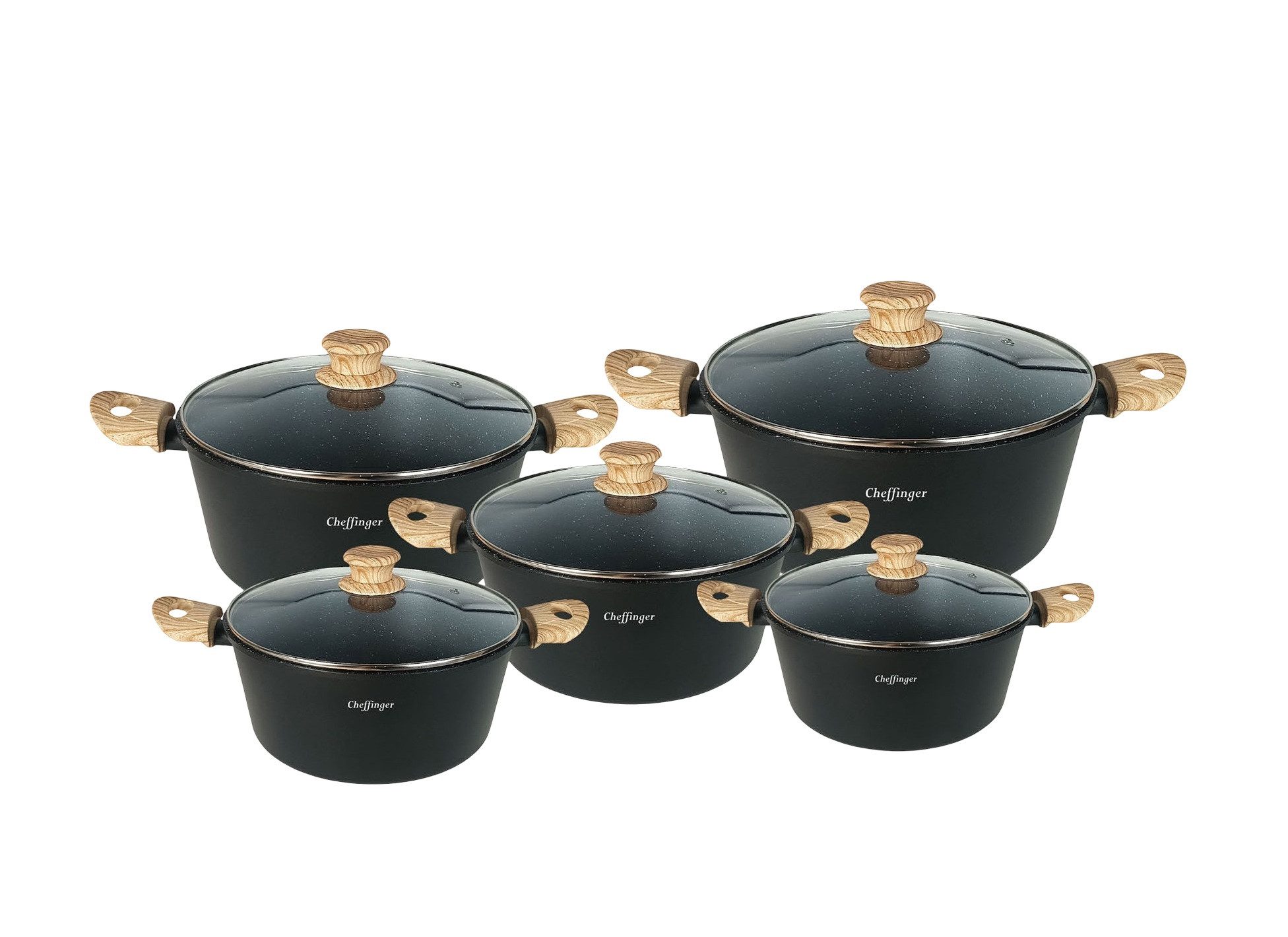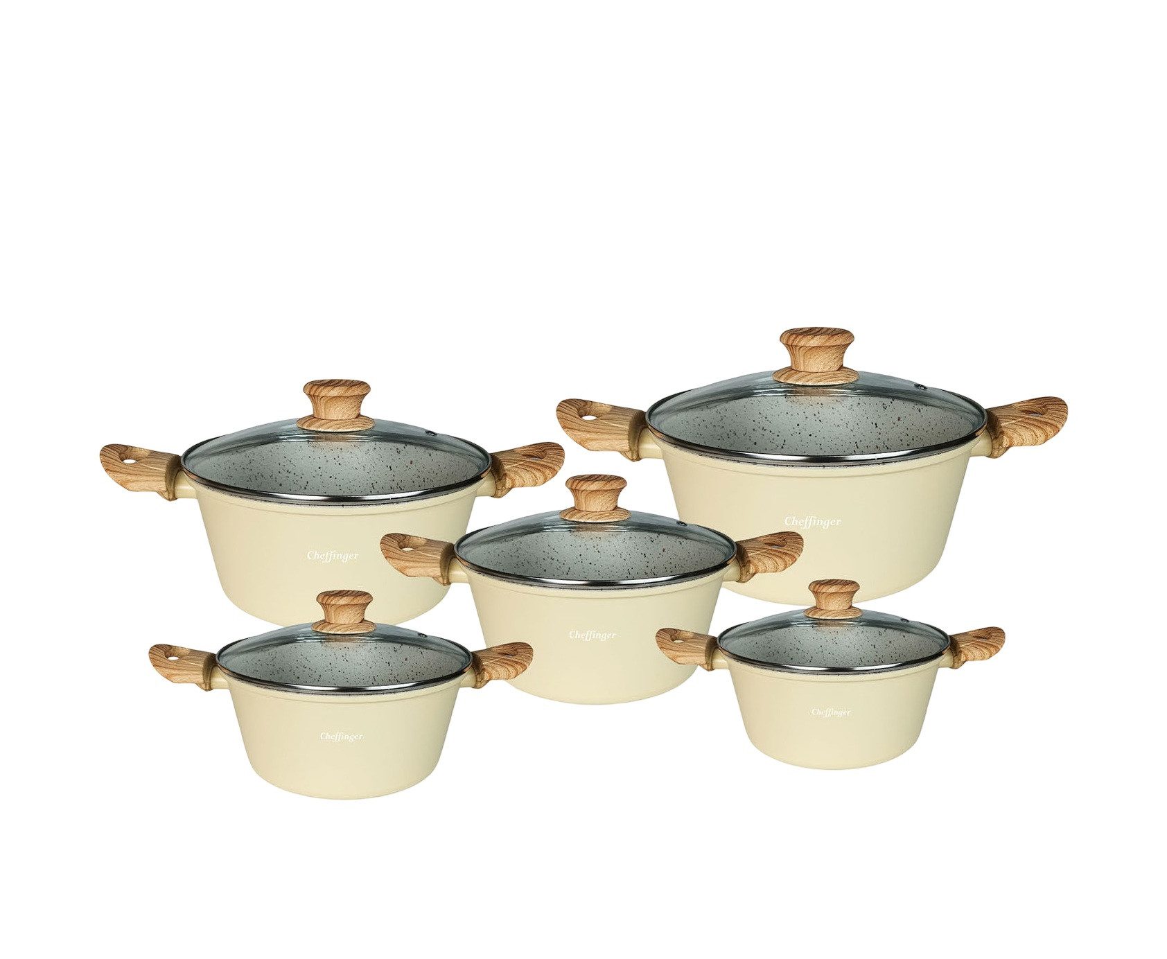 Die Töpfe sind aus hochwertigem Aluminiumguss gefertigt und verfügen über eine dreifache Antihaft-Marmorbeschichtung, die für gesundes Kochen mit wenig Fett sorgt.