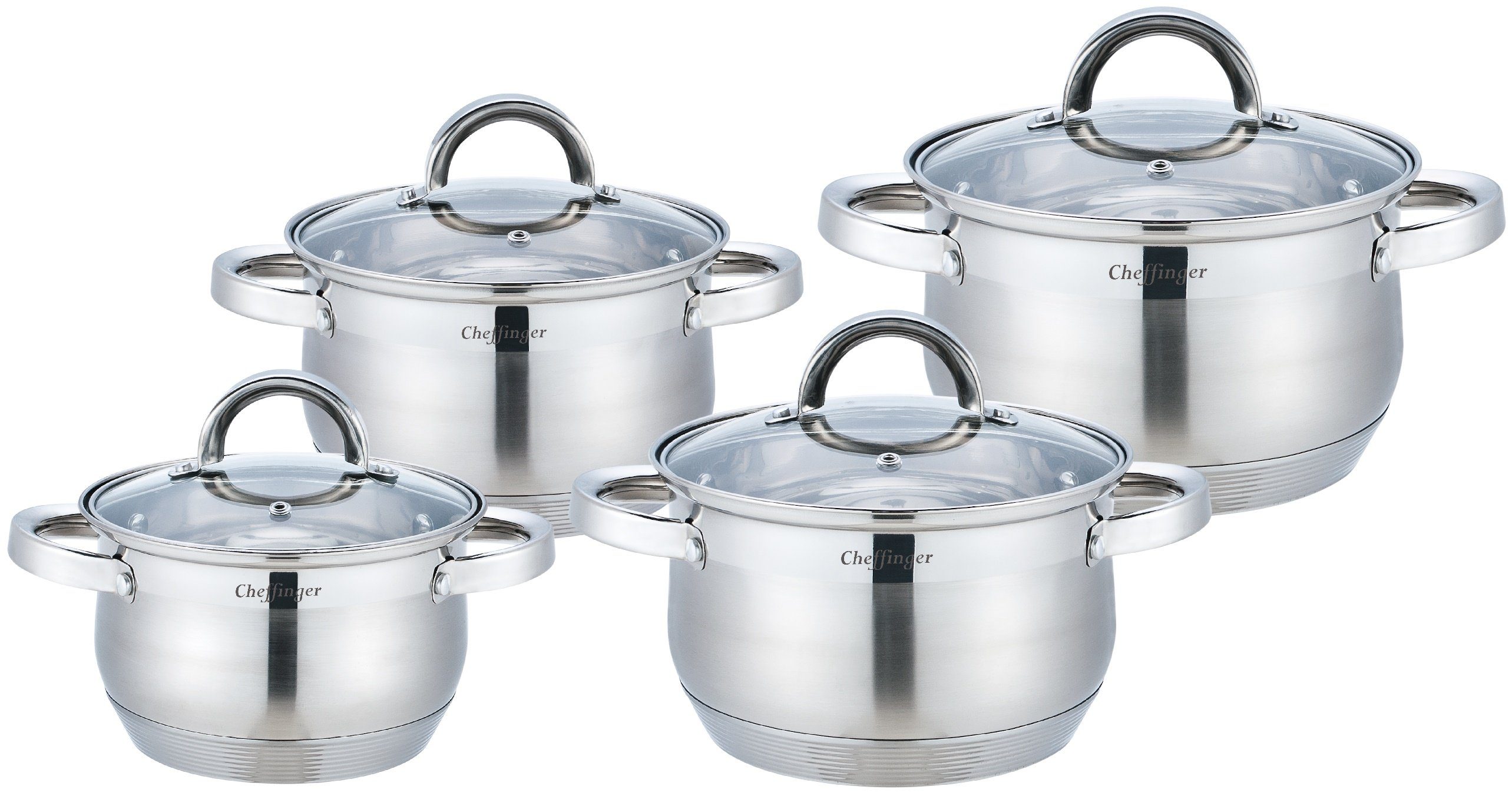 Ein Topf-Set welches sich auch wirklich Lohnt – Das 8-Teilige Topf-Set besteht aus 4 Kochtöpfen mit Glasdeckeln. Все Töpfe haben eine optimierte Wärmeleitung. Die Glasdeckel haben jeweils ein Dampfloch zum Dampfabzug. Des Впередen ist das Set reinigungsfreundlich und kann auf allen Herdarten genutzt werden.