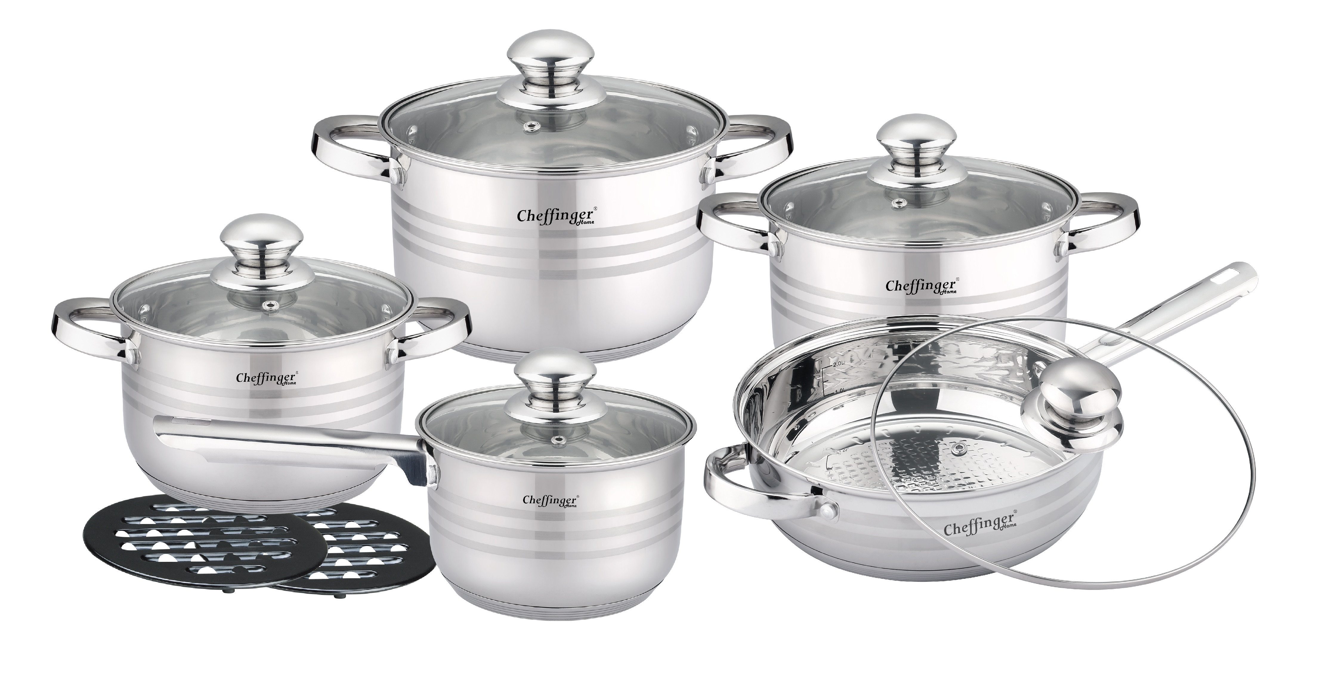Mit diesem 12-teiligen Kochgeschirrset aus Edelstahl können Sie die köstlichsten Gerichte zubereiten.