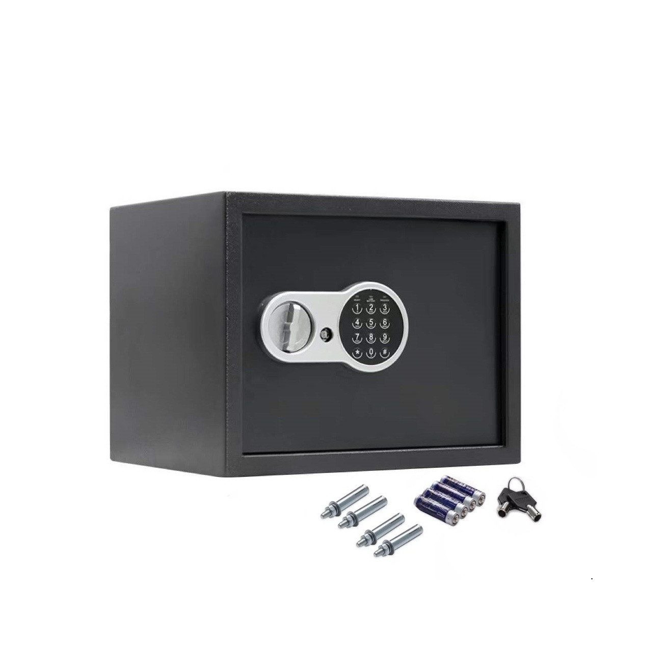 Lieferumfang | Tresor mit Zahlenschloss 4x Batterien 2x Notschlüssel 4x Befestigungsschrauben Herausnehmbarer Filz-Einlegeboden & Regal |