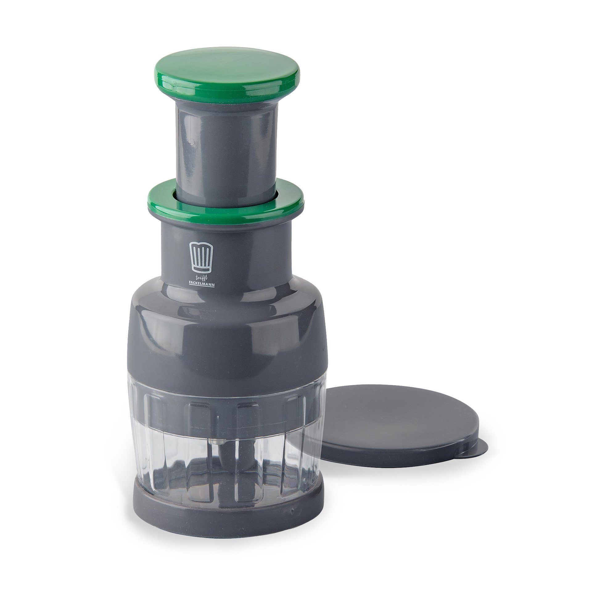 LIEFERUMFANG – Was erhältst du? 1x Chefkoch Gemüseschneider 2-teilig. Dieser Küchenhelfer Zerkleinerer mit scharfen Rotationsklingen hat die Maße 9,5 cm x 9,5 cm x 22,5 cm und ist aus langlebigem Kunststoff und rostfreiem Edelstahl gefertigt.