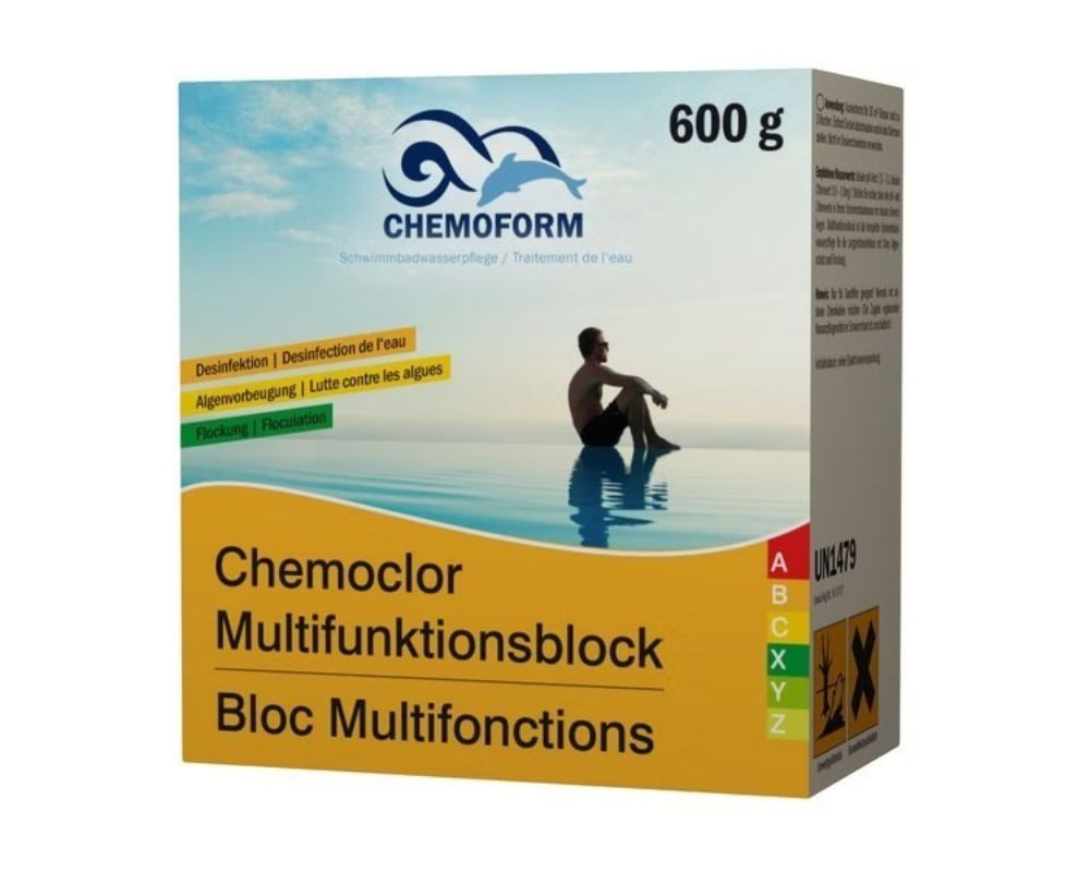 Langsamlöslicher 600 g Block. Mit Mehrfachfunktion. Dauerchlorung mit gleichzeitiger Flockungsmittelzugabe und Algenverhütung.