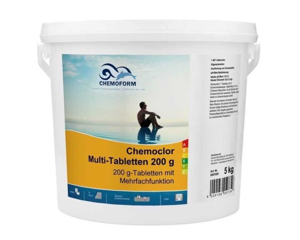 Chemoclor Multifunktionstablette ist eine hochwertige langsam lösliche Wasserpflege Tablette mit Chlor, Flockung und Algenverhütung. Die Multitab löst sich im Becken rückstandslos auf und sorgt für kristallklares Schwimmbadwasser und ein ungetrübtes Badevergnügen.