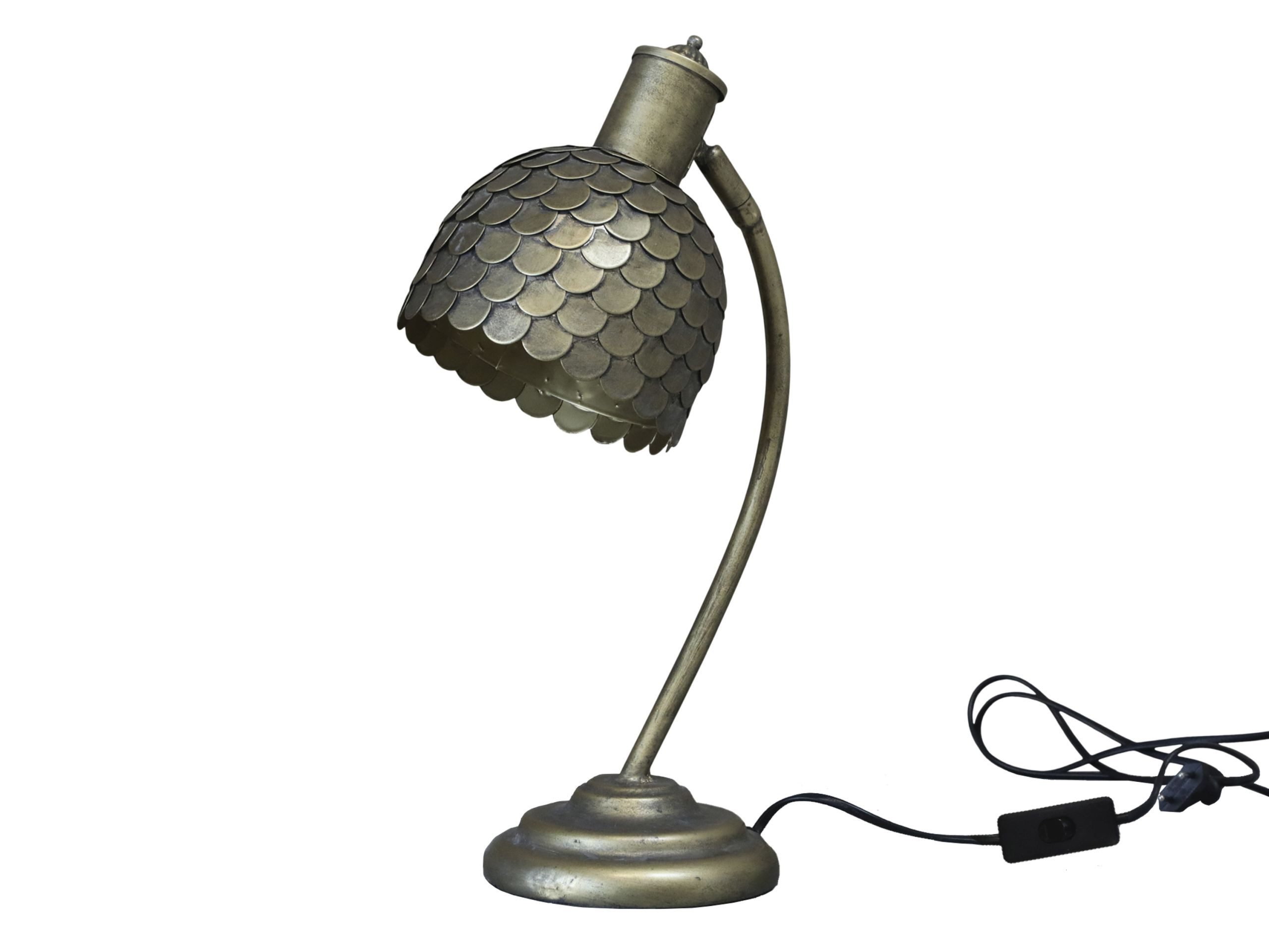 Diese sehr schön gestaltete Tischlampe aus Metall besticht durch die stilvolle Ausführung in antikem Messing und dem Schuppeneffekt des Schirms. Der Fuß und der verstellbare Arm verleiht der Tischleuchte eine robuste, industrielle Note. Durch das goldene Innenleben wird das Licht warm reflektiert und zaubert ein gemütliches Ambiente. Die auffällige Lampe ist insgesamt 41 cm hoch, die Öffnung nach unten beträgt Ø 15 cm. Das Kabel hat einen Kippschalter und hat eine Длина von 1.5 Meter.
