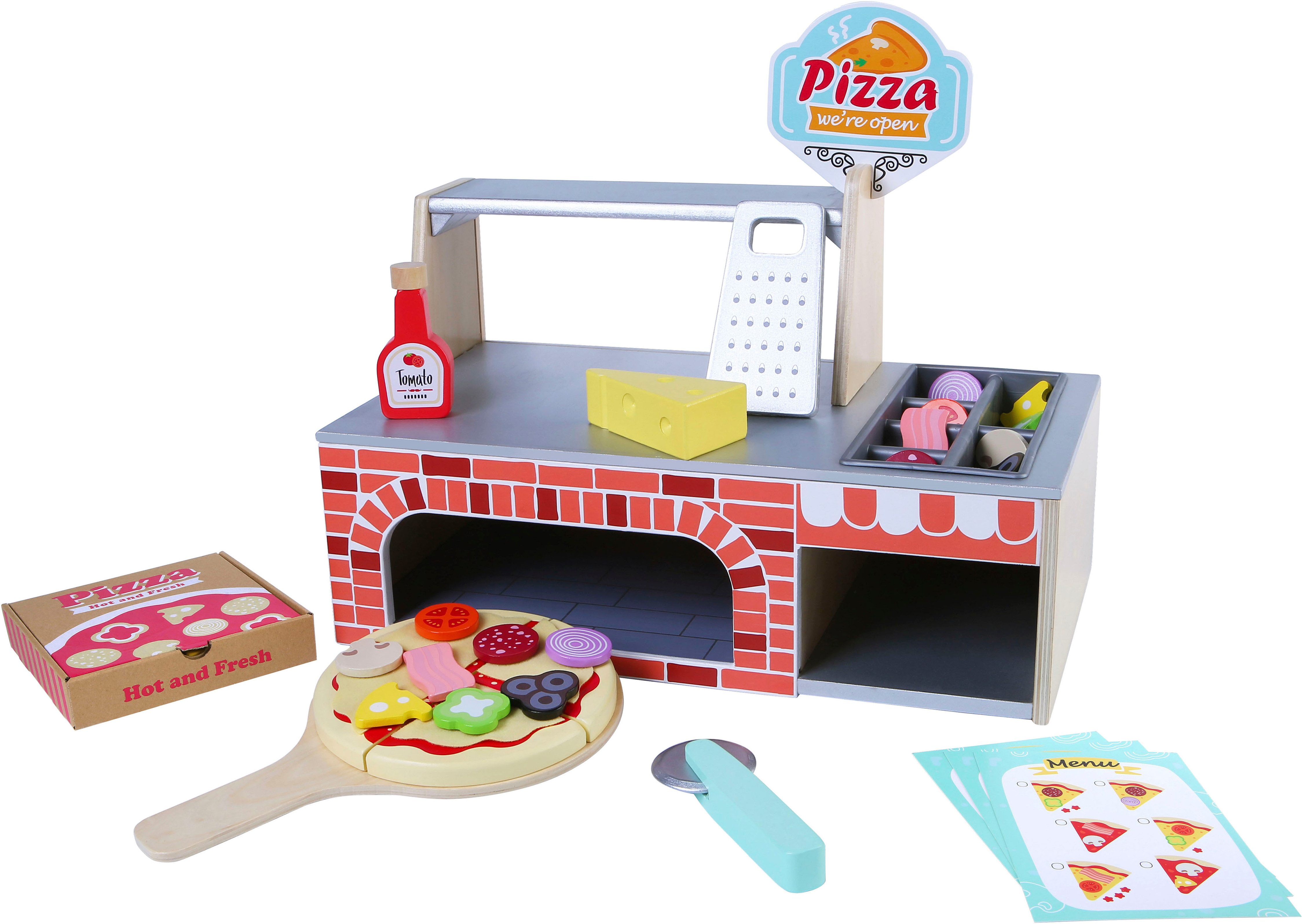 Mit verschiedenen Belägen aus Holz mit Klettverschlüssen, wie z.B. Oliven, Champignons, Zwiebeln, Salami, Tomate, Käse, Speck und Paprika und 4-teiliger Pizza