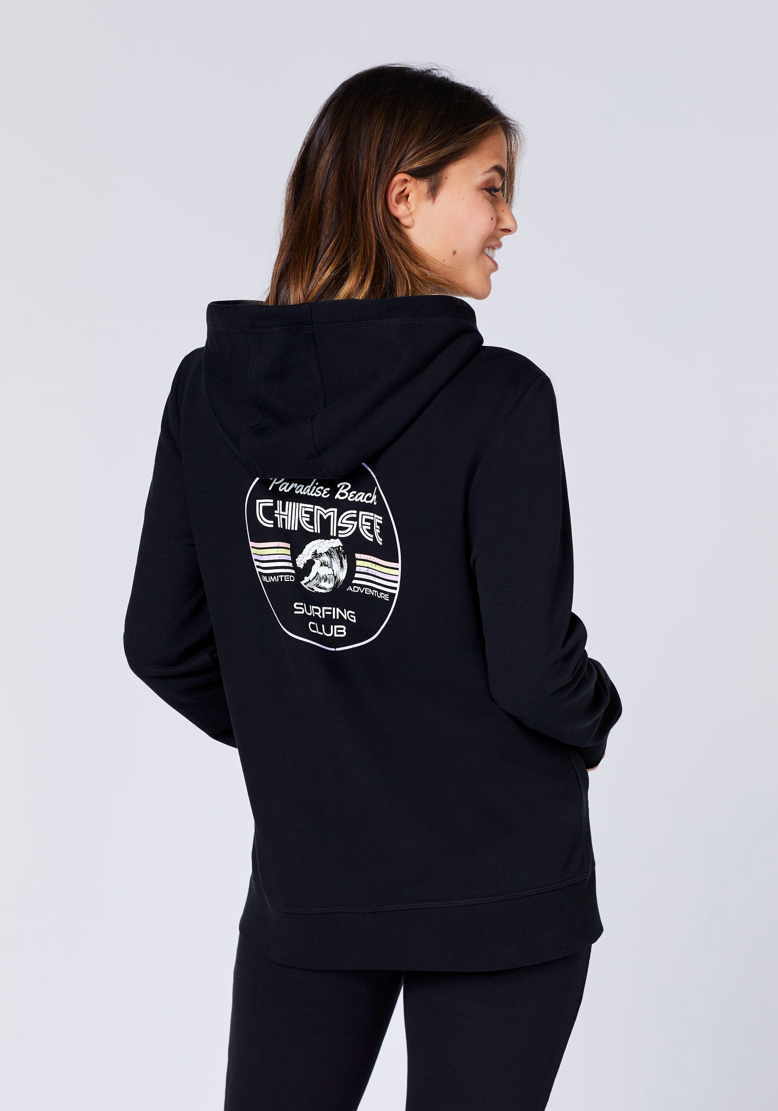 Mit dem freshen CHIEMSEE Surfing-Club-Motiv haucht die Kapuzenjacke deinen Outfits lässige Vibes ein. Streifen, Wellen und weitere Schriftzüge ergänzen das rückseitige Print-Design in Vintage-Optik. Noch mehr Extras addieren das farblich abgesetzte Tunnelzugband, die Logo-Zuglasche am Zipper und die Stickerei vorne. Dank des Baumwollgemischs und des lockeren Fits ist das Essential so bequem. Streetwear mit Label-Twist wie die Damen-Sweatjacke von CHIEMSEE muss man einfach lieben.