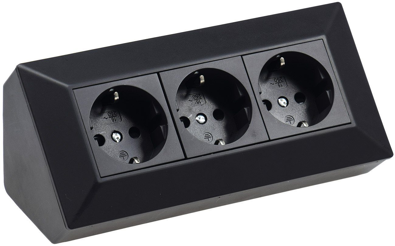 Ideal für Montage z.B. auf der Arbeitsplatte in der Küche,. in Werkstätten etc. 3er Steckdosenblock inklusive Gehäuse mit 45° Anwinkelung. Technische Details