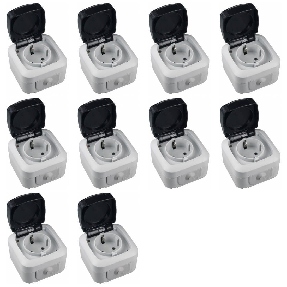 10er Set spritzwassergeschützte Steckdose in Aufputz-Ausführung für 250V/50Hz, max. 16A.