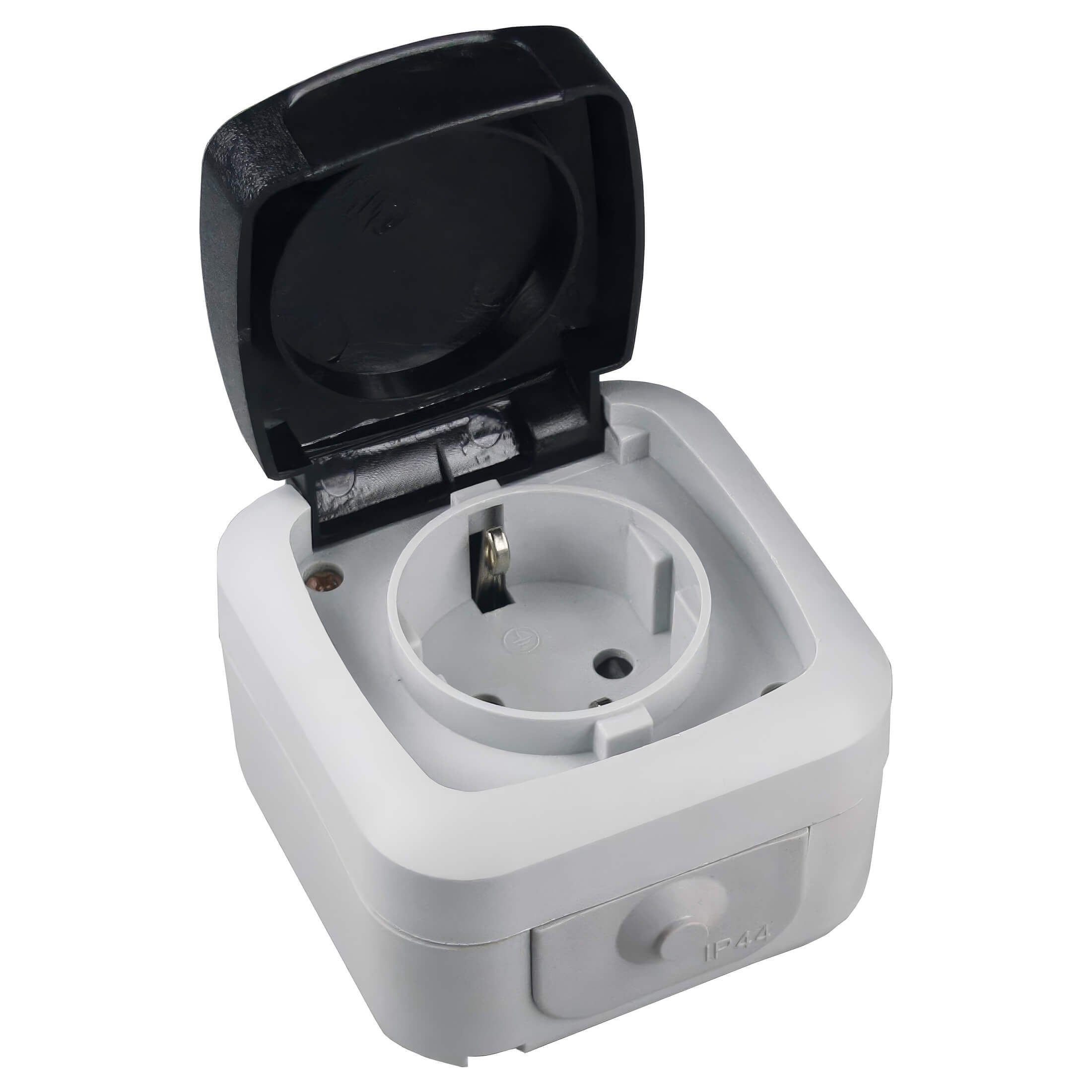 Spritzwassergeschützte Steckdose in Aufputz-Ausführung für 250V/50Hz, max. 16A.