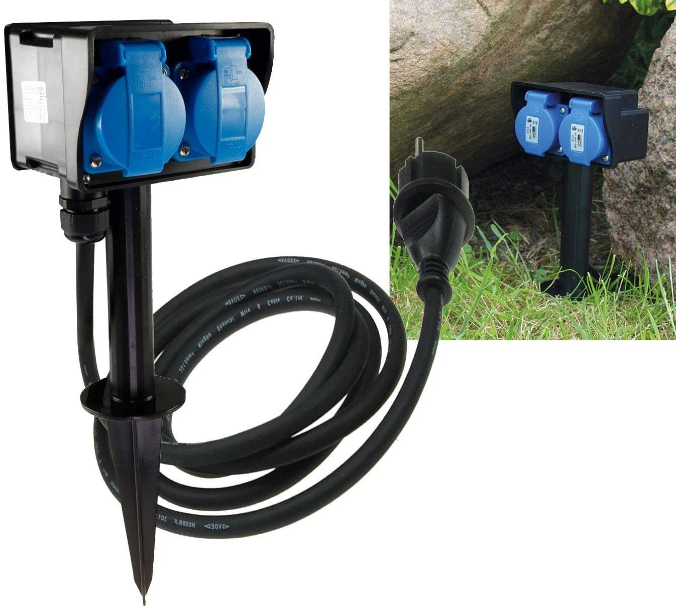 Steckdosenblock für Aussen 2-fach Verteiler 2m Kabel Erdspieß-Steckdose IP44 230V Aussen-Steckdose mit Schutzdeckel