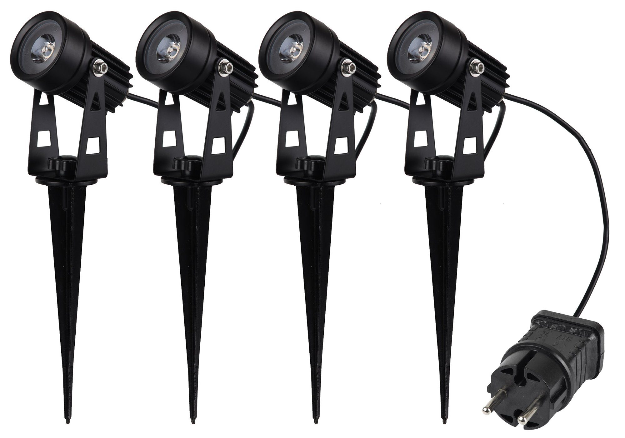 4er Set Gartenleuchten mit 230V Netzteil für Betrieb um Haus und Garten. Die Aussenleuchten können Aufputz angeschraubt oder mittels Erdspieß direkt am Wunschort im Beet, am Busch / Baum montiert werden. Die 2m langen wettergeschützten Verbindungskabel sorgen für Freiheit bei der Wahl des Ortes. Das warmweiße Licht setzt Ihre botanischen Lieblinge richtig in Szene und vermittelt ein gemütliches Ambiente. Der besonderer Clou: die Gartenleuchten werden mit Kabeln direkt von Spot zu Spot verbunden. Dies spart etliche Meter Kabel und ermöglicht einen praktischen Einsatz über eine längere Distanz z.B. am Weg und Hauseingang.