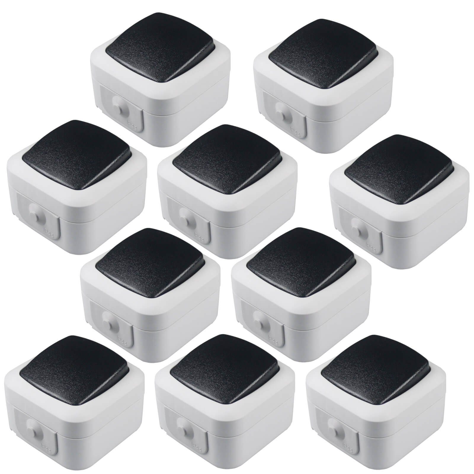 10er Set spritzwassergeschützter Wechselschalter in Aufputz-Ausführung für 250V/50Hz, max. 10A. Hellgrauer Rahmen mit dunkelgrauer Wippe.