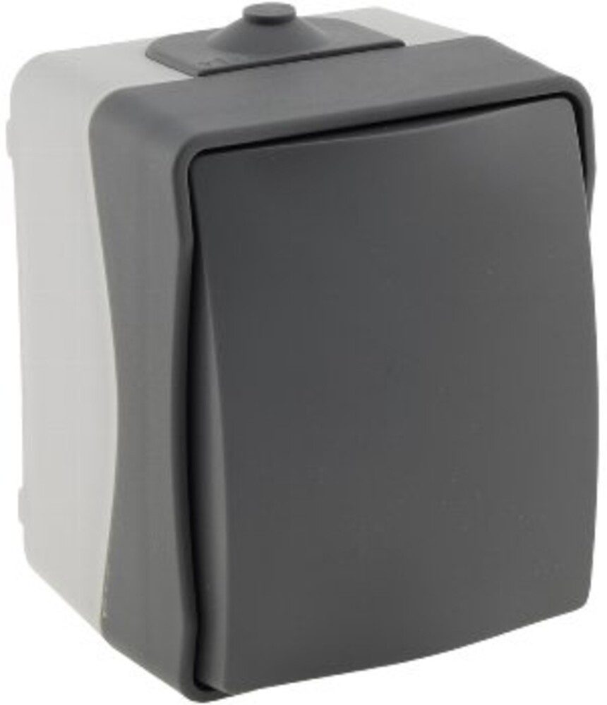 Spritzwassergeschützter Wechselschalter in elegantem Design und wertigem Finish. Zweifarbiger Aufputz-Rahmen mit dunkelgrauem Deckel. - komfortable Installation: Schraubenlose Terminals - spritzwassergeschützt IP54 - 250V~/ max. 10A - stabiler, wetterbeständiger Kunststoff - gummierte Kabeleinführung - HxBxT 77x62x55mm